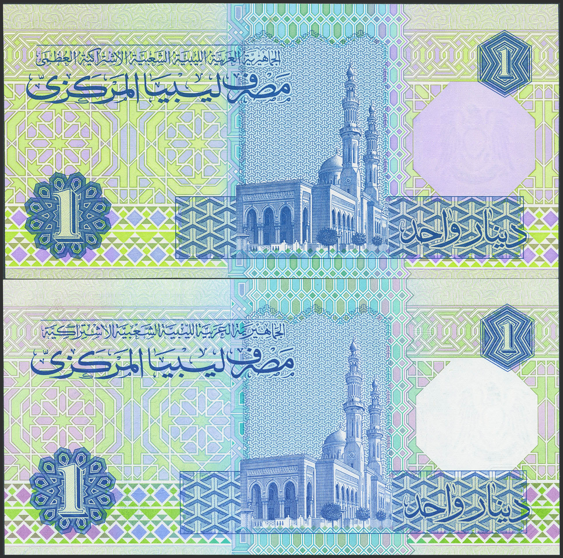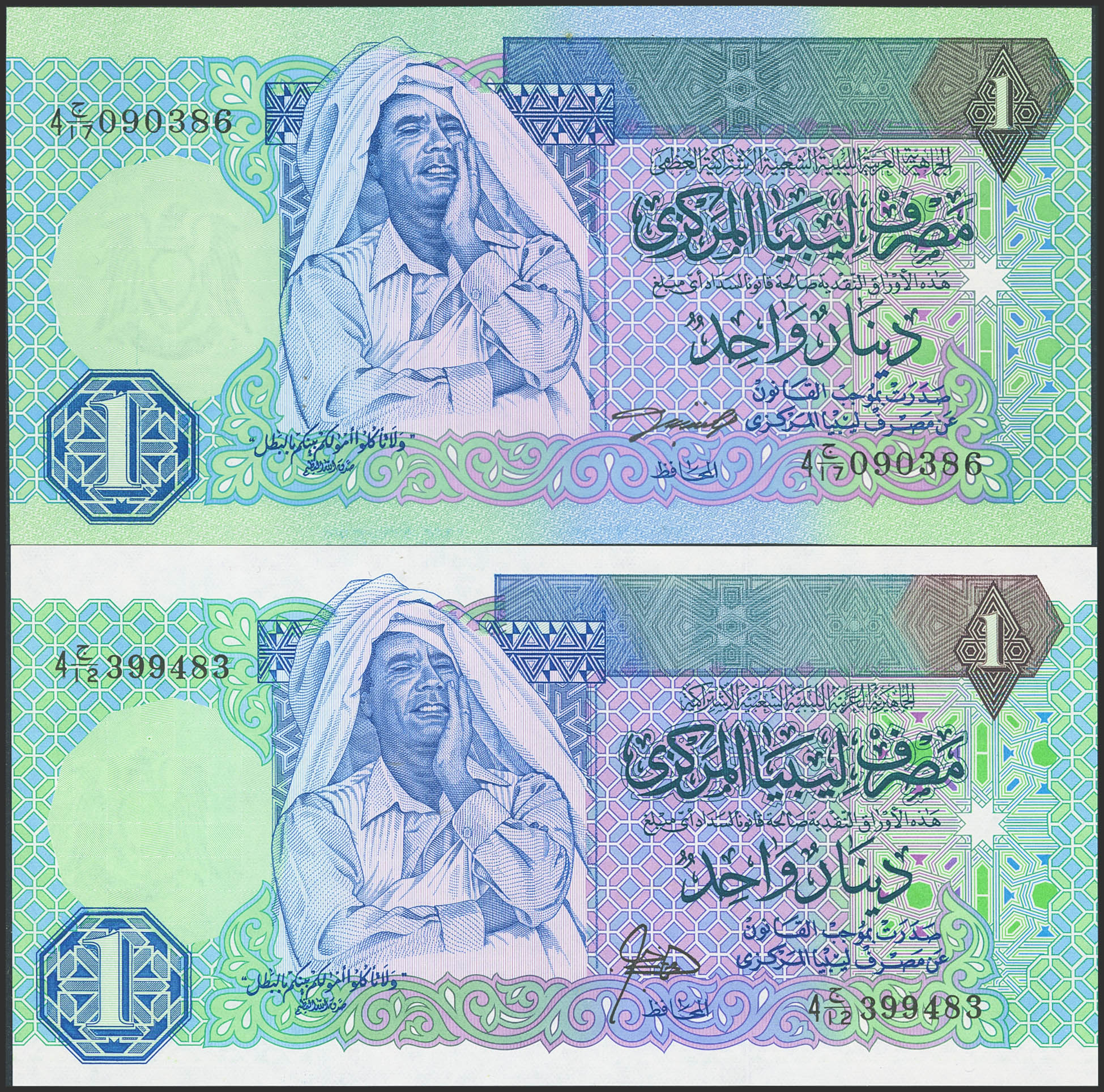 LIBYA. Lot of 2 notes of 1 Dinar. (1991ca). Central Bank. (Pick: 54, 59a). Uncirculated.