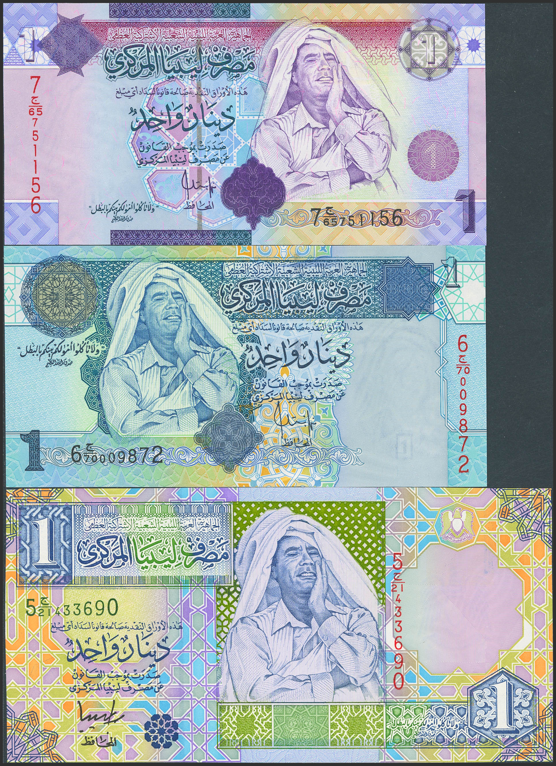 LIBYA. Lot of 3 notes of 1 Dinar. 2002 to 2008. Central Bank. (Pick: 64b, 68b, 71). Uncirculated.