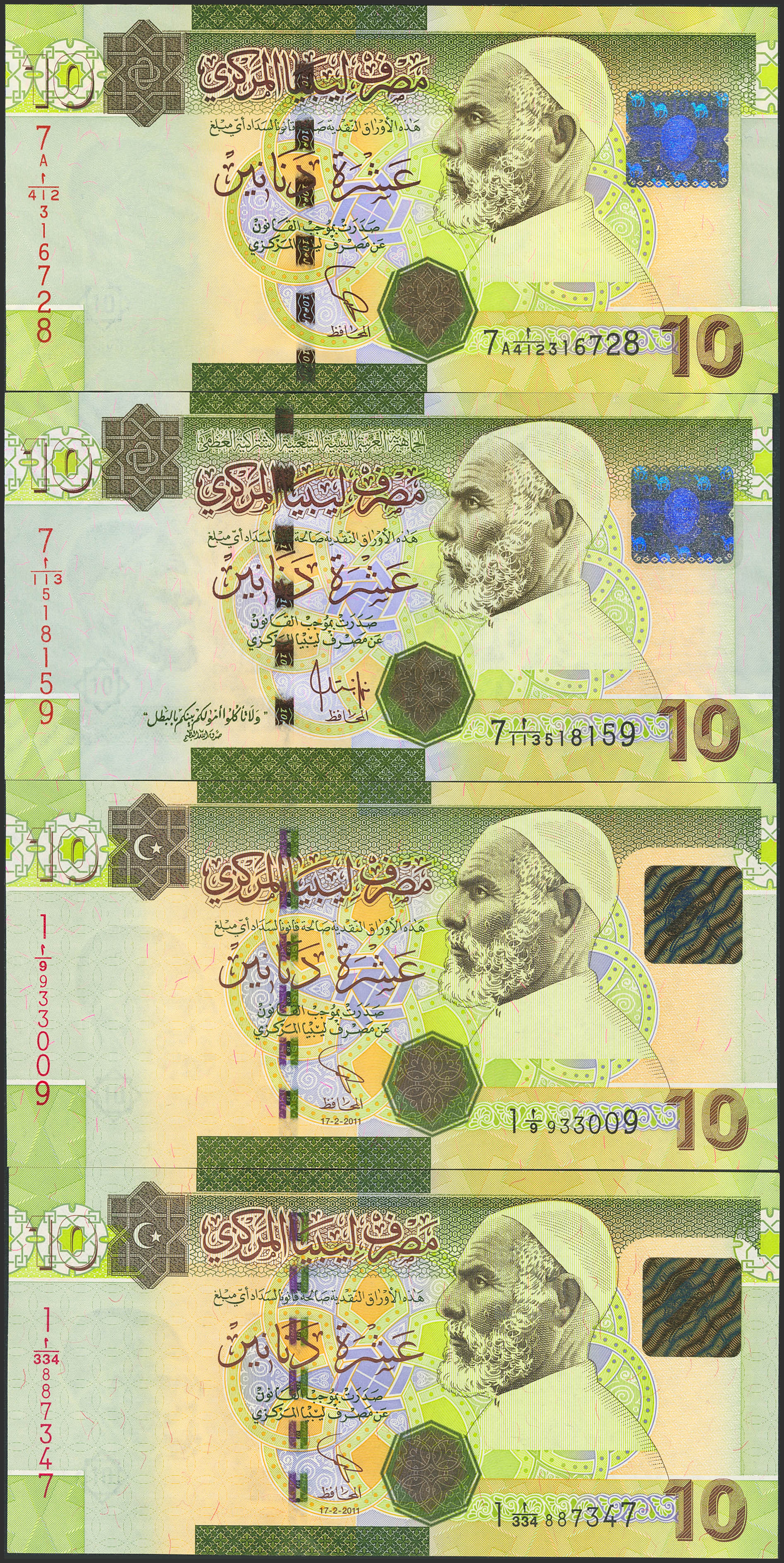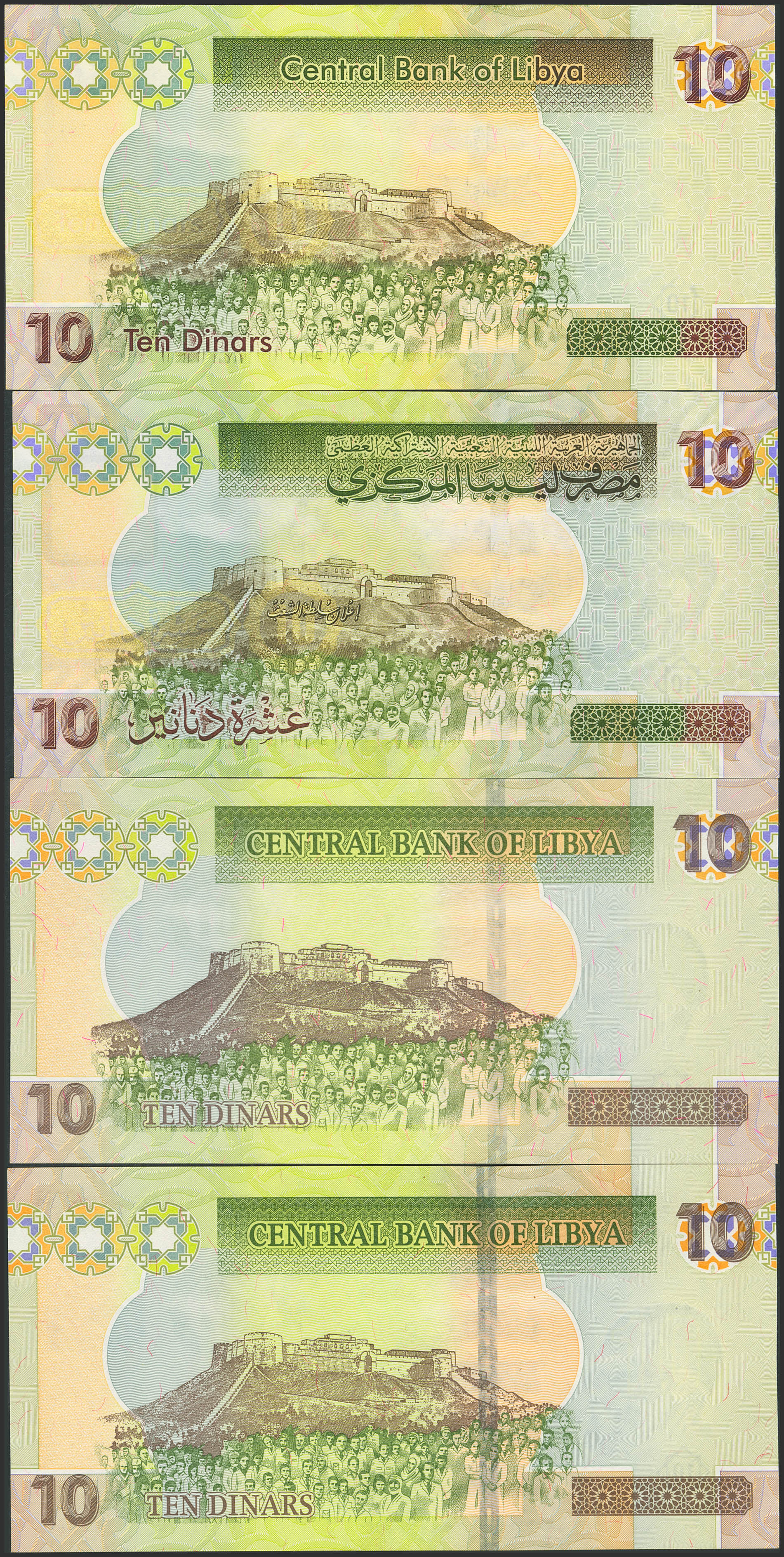 LIBYA. Lot of 4 notes of 10 Dinars. 2008 to 2013. Central Bank. (Pick: 73, 78, 78Aa, 78Ab). Uncirculated.
