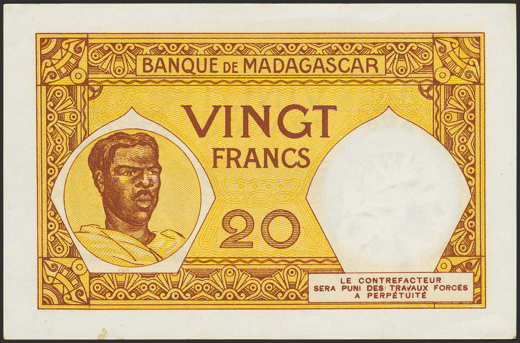 English MADAGAUncirculatedAR. 20 Francs. (1937ca). Bank of Madagascar. (Pick: 37). Stains. Almost Uncirculated.