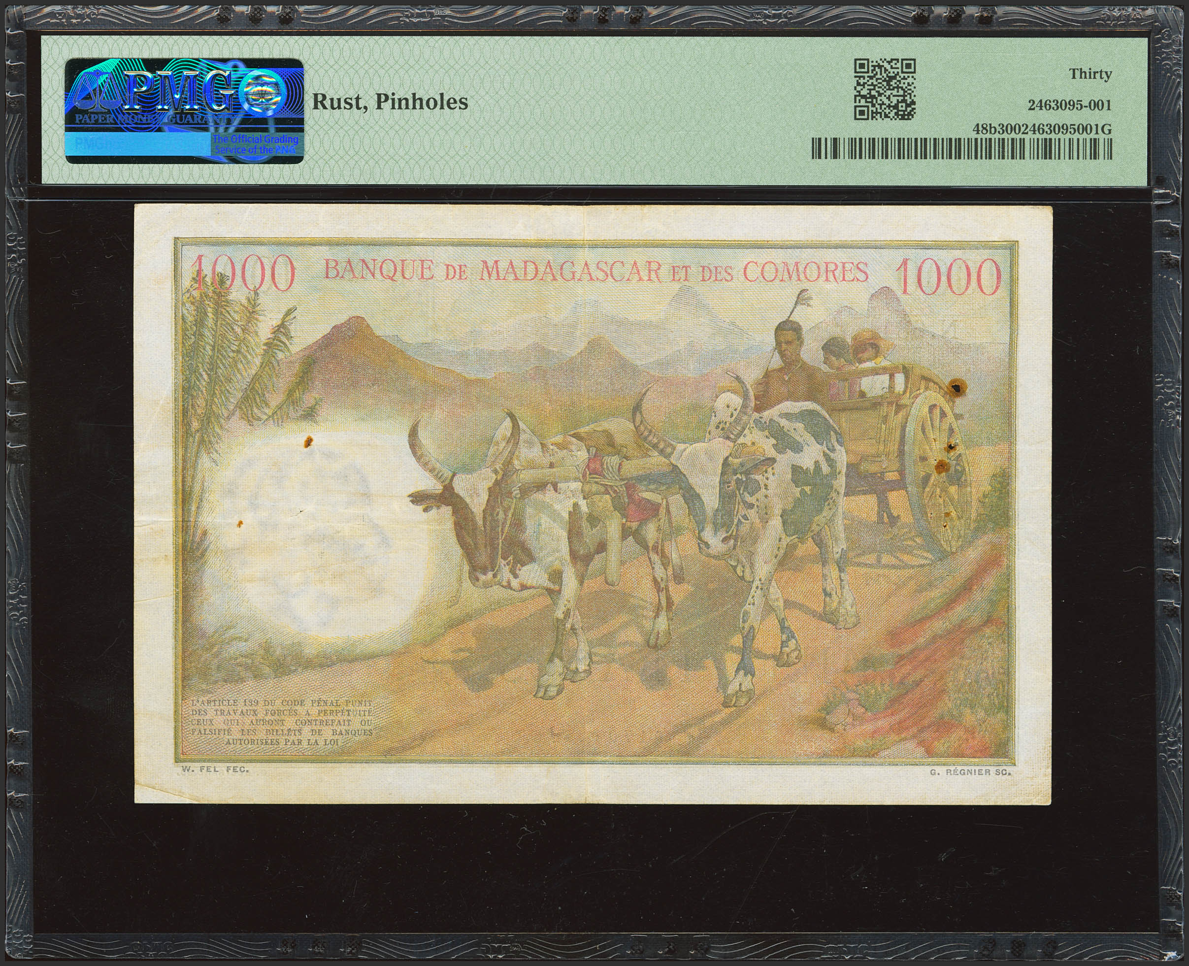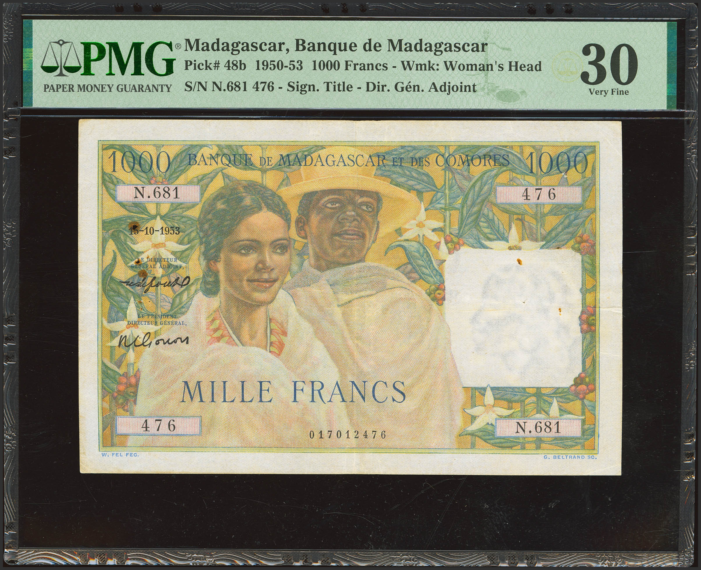English MADAGAUncirculatedAR. 1000 Francs. 15 October 1953. Banque de Madagascar et des Comores. (Pick: 48). PMG30 (rust, pinholes).