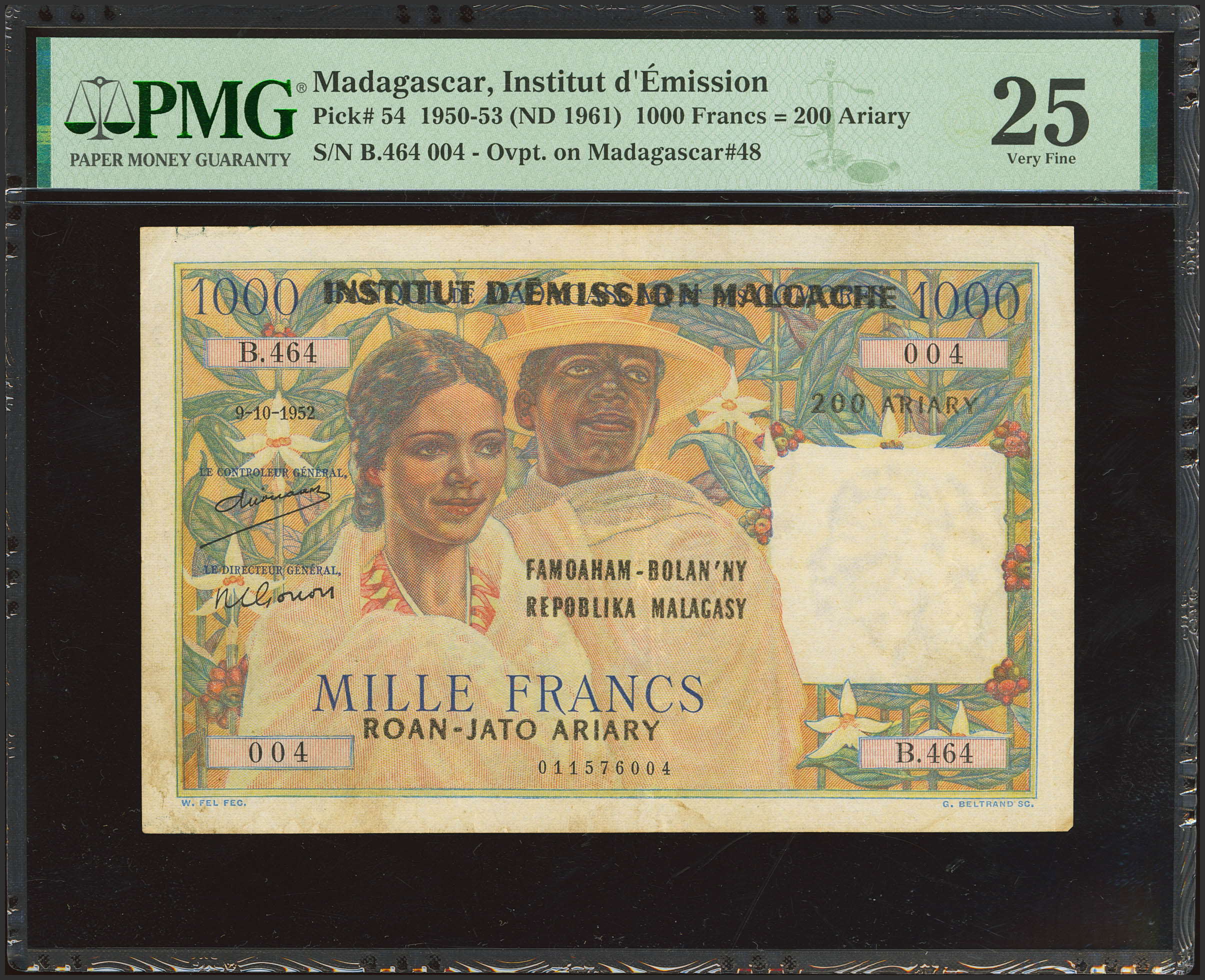 English MADAGAUncirculatedAR. 1000 Francs. 9 October 1952. Institut d'Emission Malagache. (Pick: 54). PMG25 (serial number 4, minor rust)