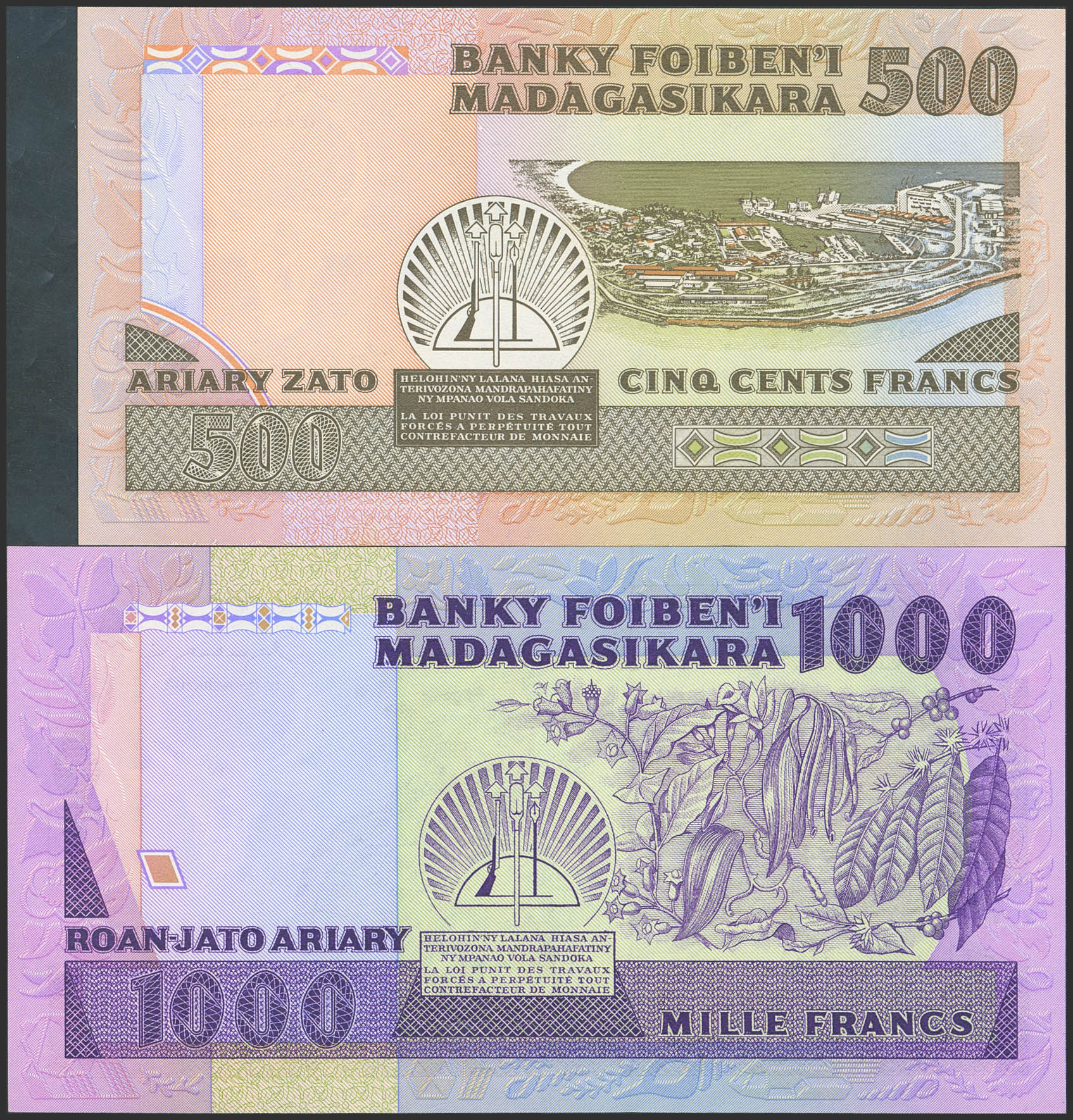 English MADAGAUncirculatedAR. Lot of 2 notes of 500 and 1000 Francs. (1983ca). Banky Foiben'i Madagasikara. (Pick: 67a, 68a). Uncirculated.