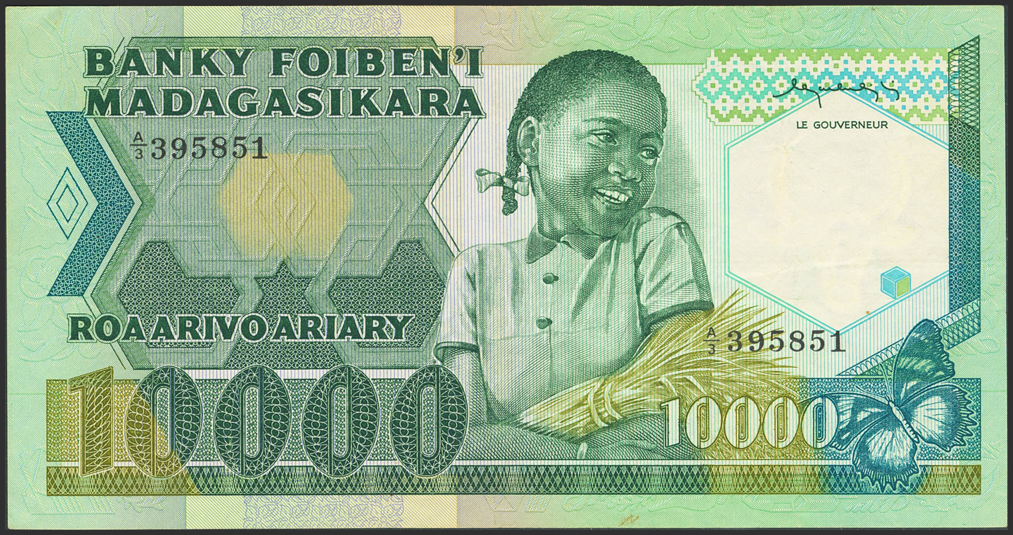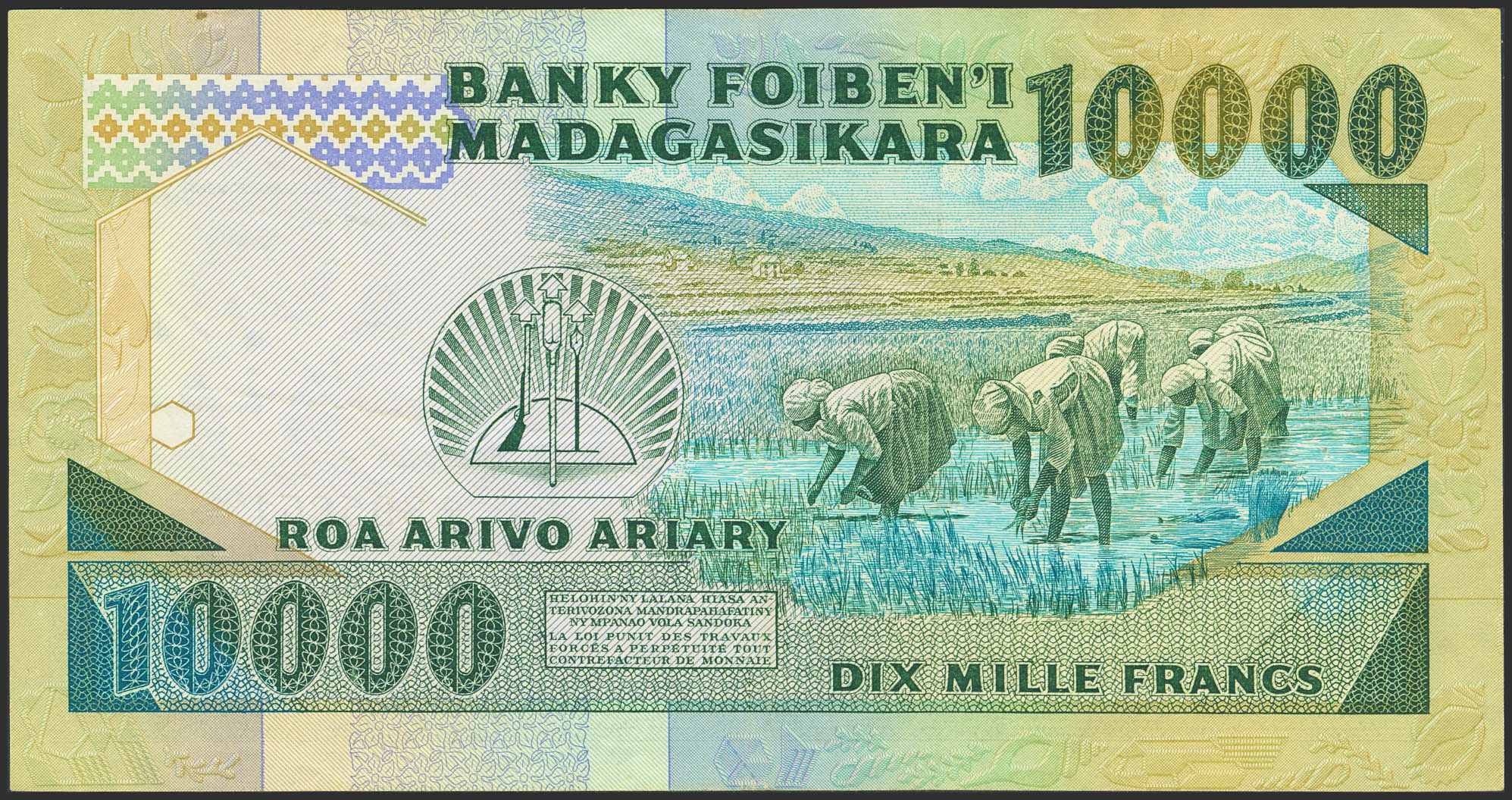 English MADAGAUncirculatedAR. 10000 Francs. (1983ca). Banky Foiben'i Madagasikara. (Pick: 70a). More than Very Fine.
