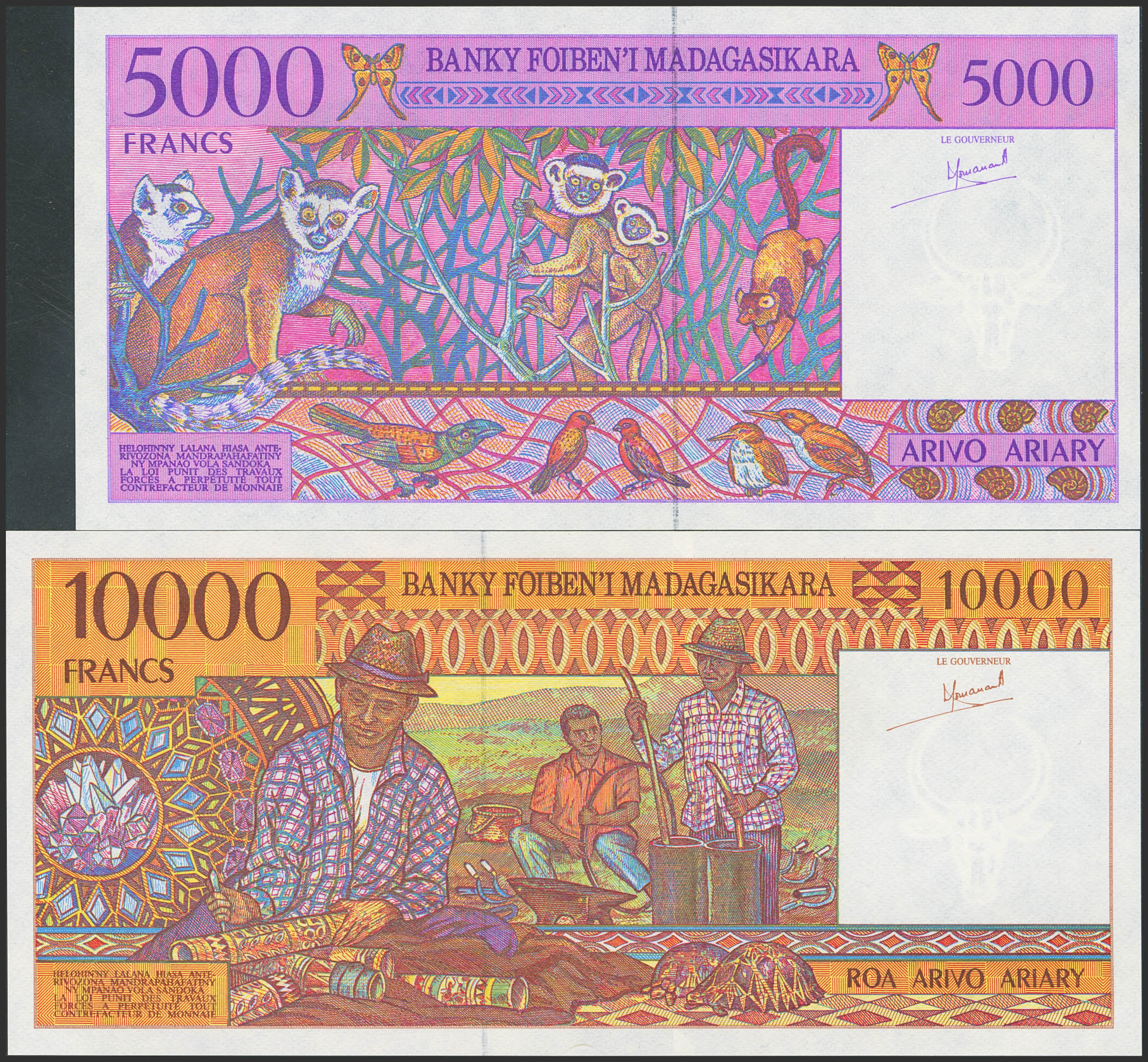 English MADAGAUncirculatedAR. Lot of 2 notes of 5000 and 10000 Francs. (1995ca). Banky Foiben'i Madagasikara. (Pick: 78a, 79). Uncirculated.