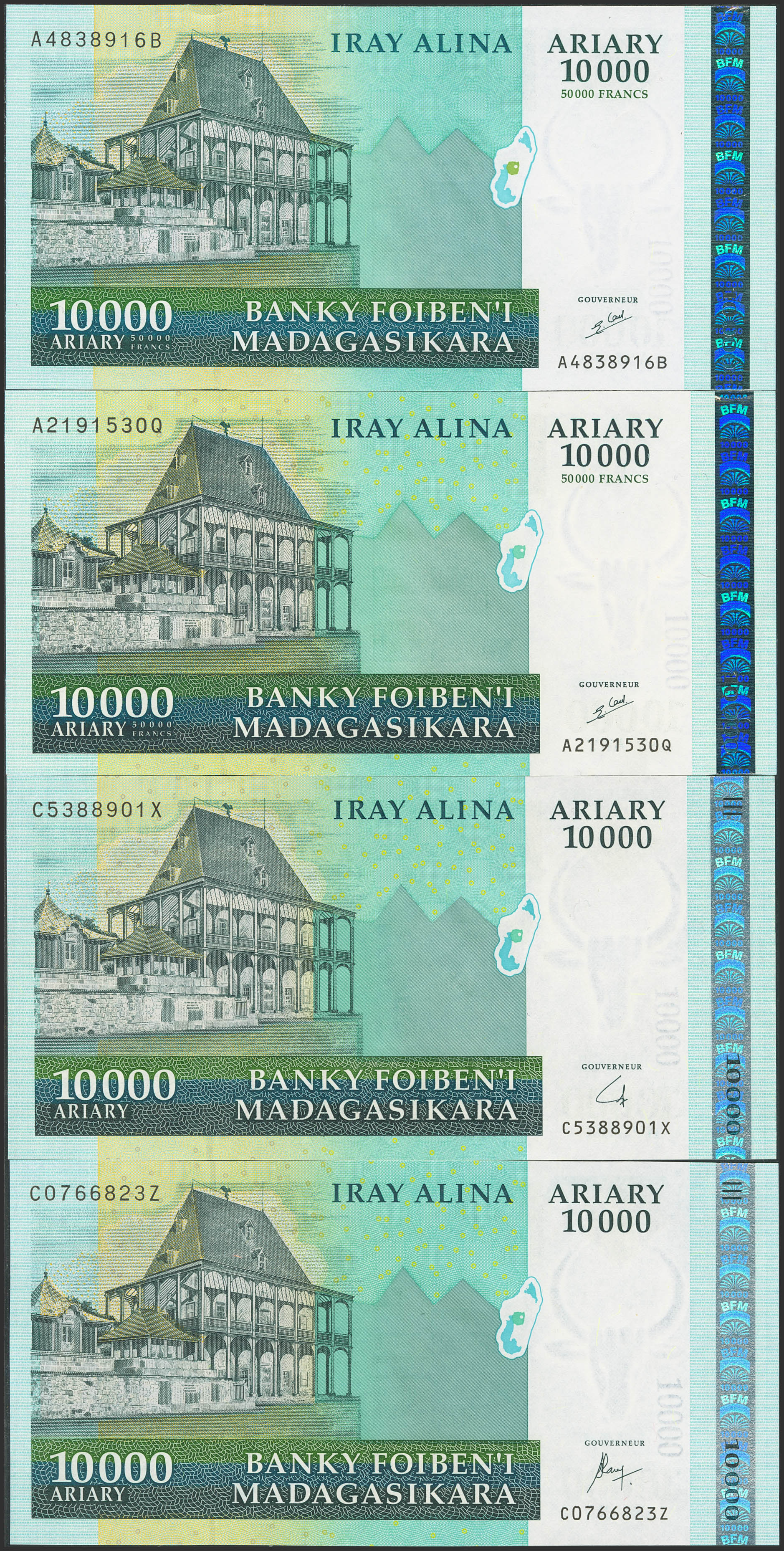 MADAGAUncirculatedAR. Lot of 4 notes of 10000 Ariary. 2003 to 2007. Banky Foiben'i Madagasikara. (Pick: 85, 92a, 92b, 92c). Uncirculated.
