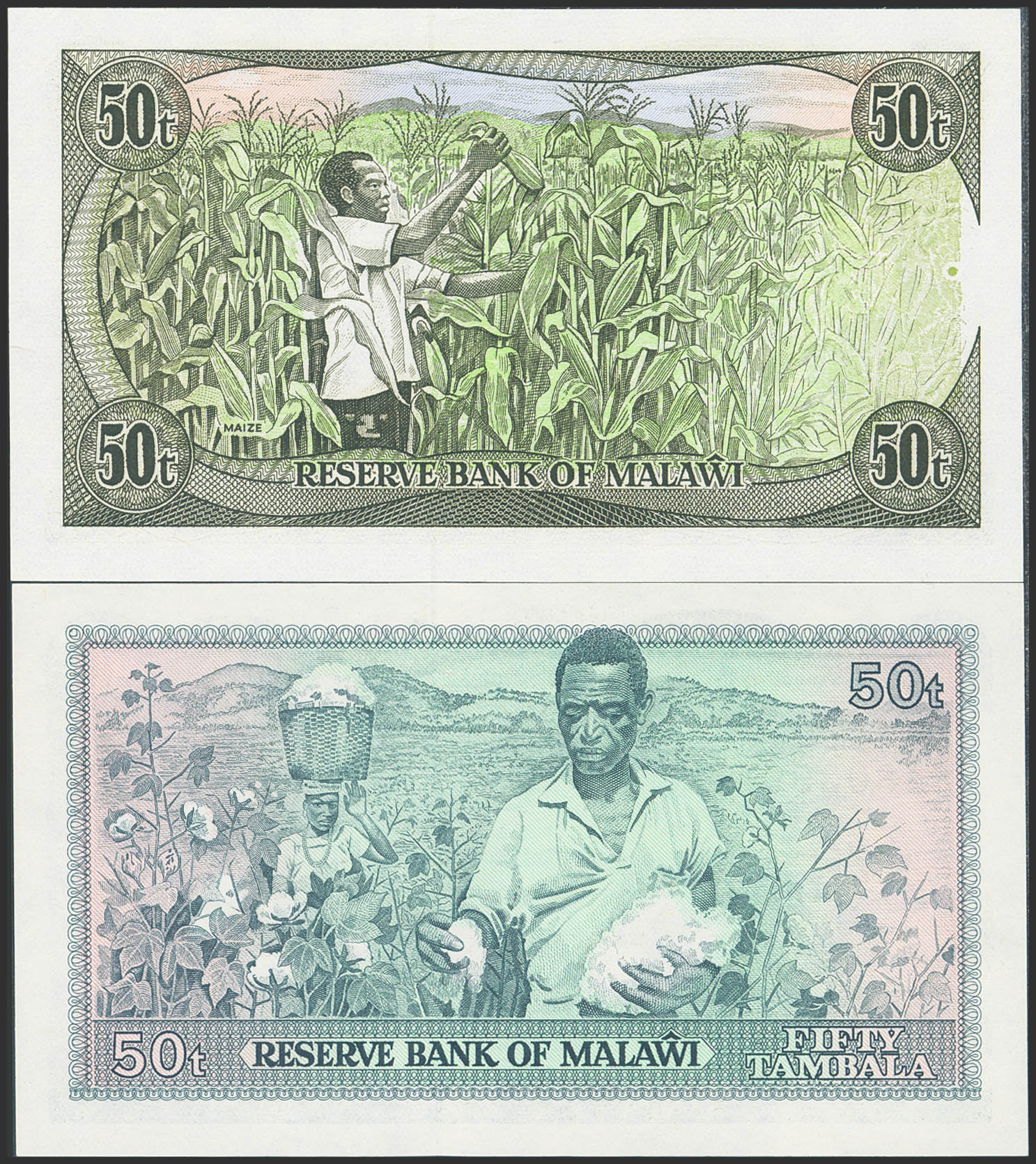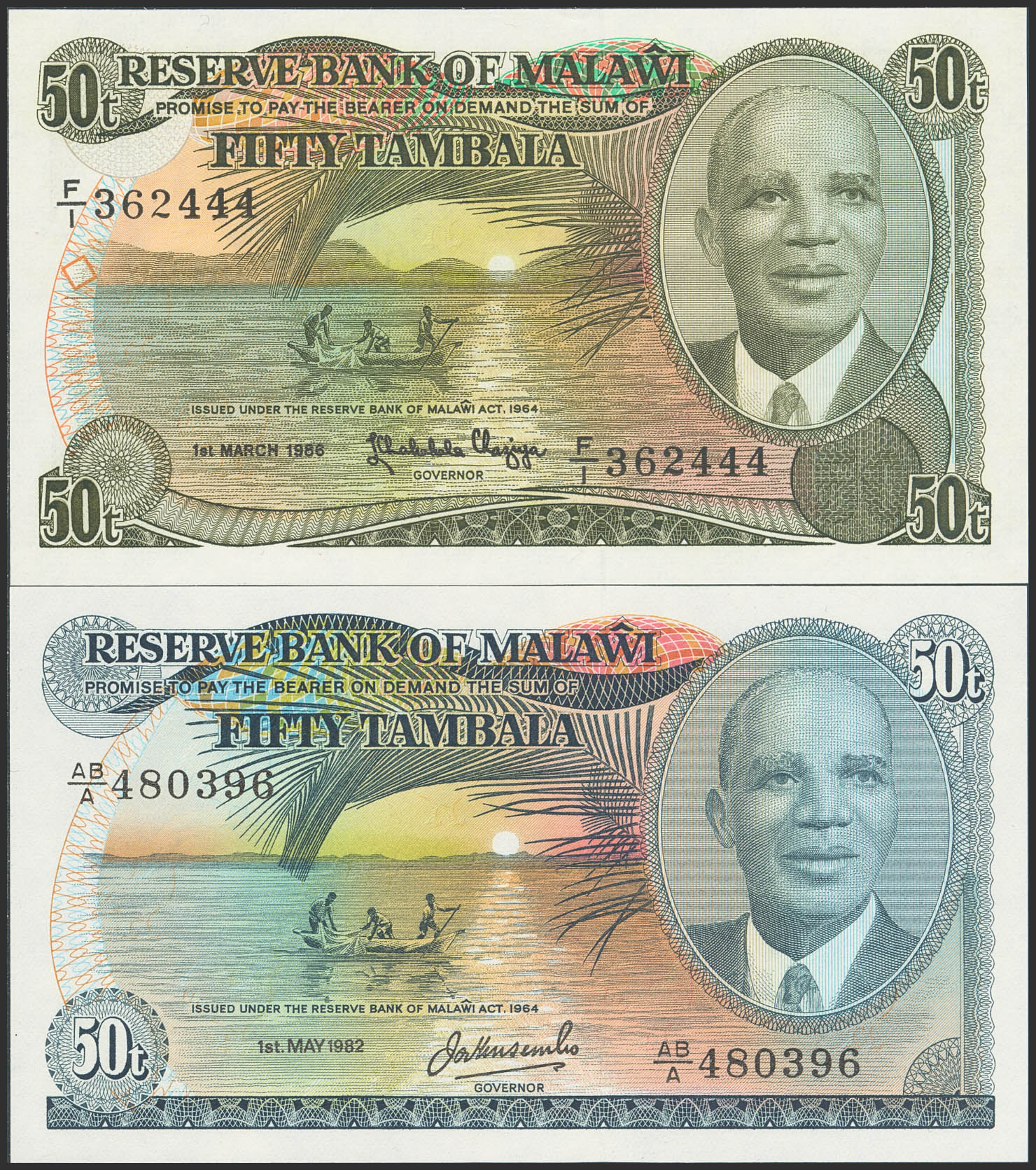 MALAWI. Lot of 2 notes of 50 Tambala. 1 May 1982 and 1 March 1986. Reserve Bank. (Pick: 13e, 18). Uncirculated.