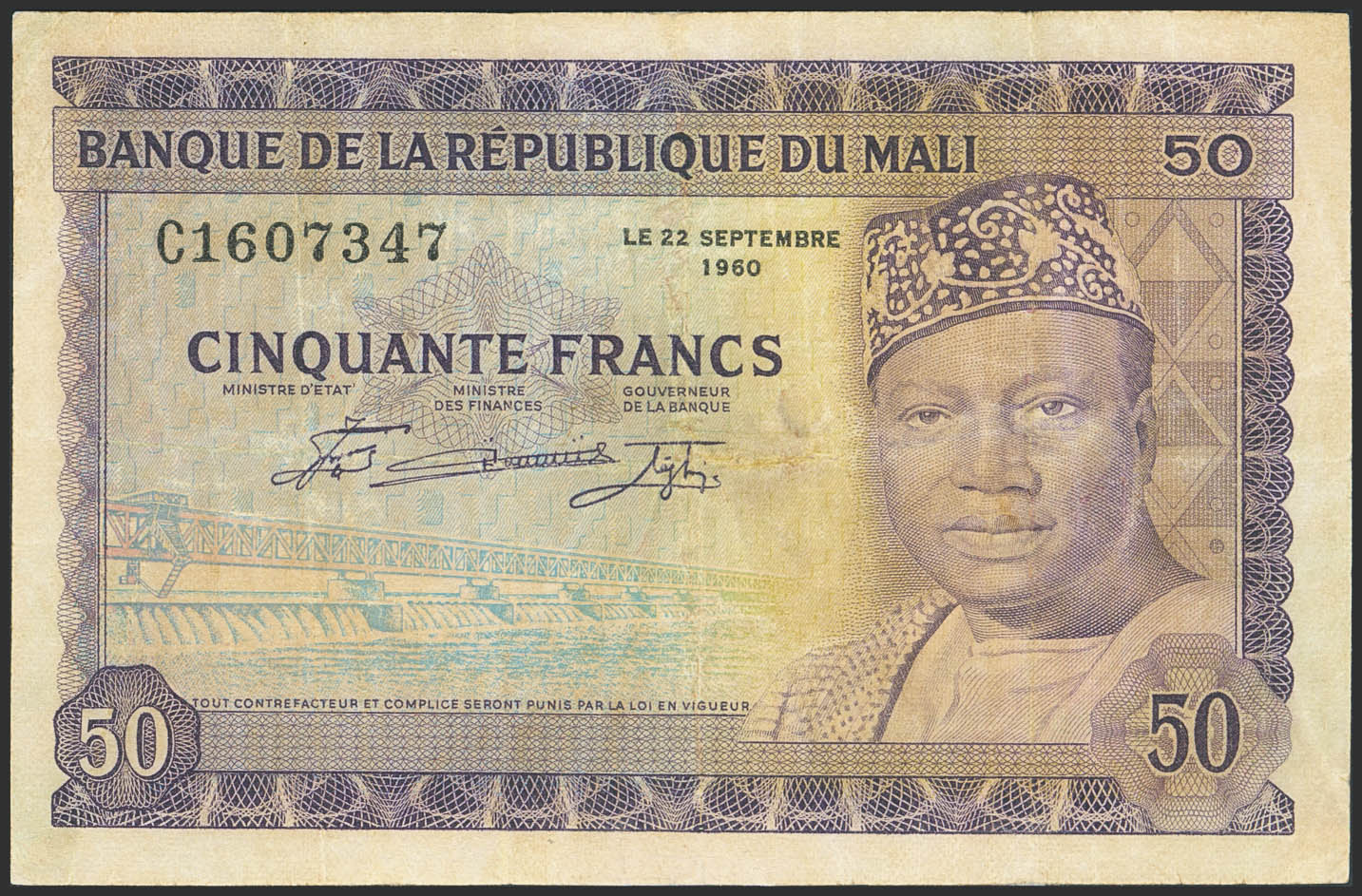 MALI. 50 Francs. 22 September 1960. Banque de la Republique. (Pick: 6). Restored. Very Fine.