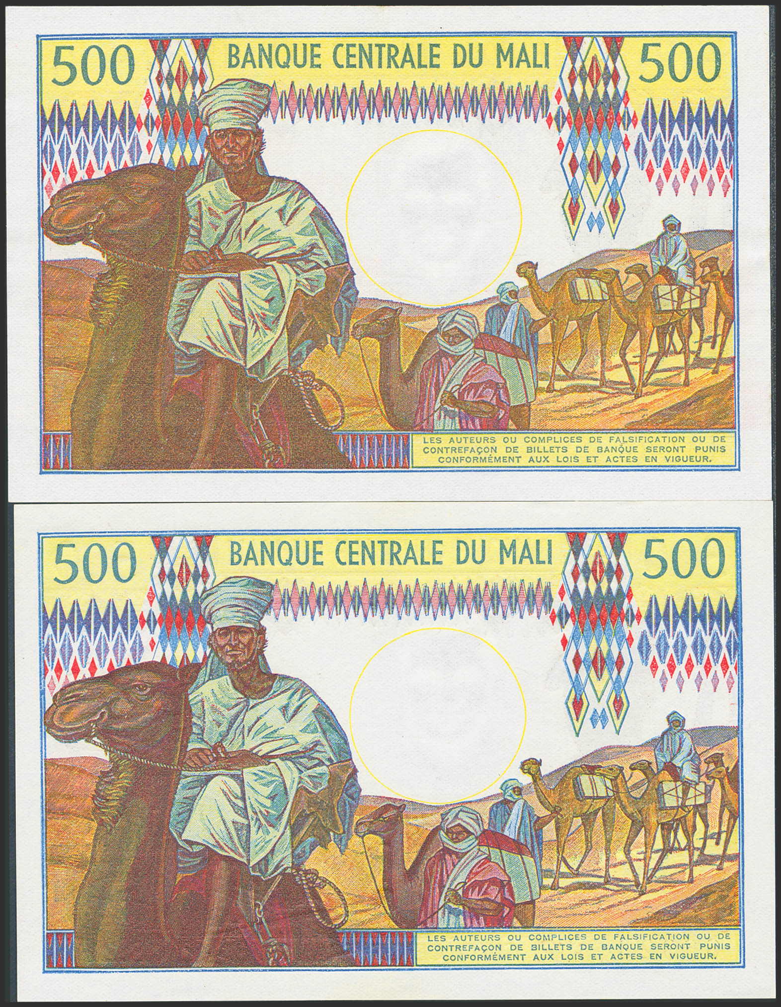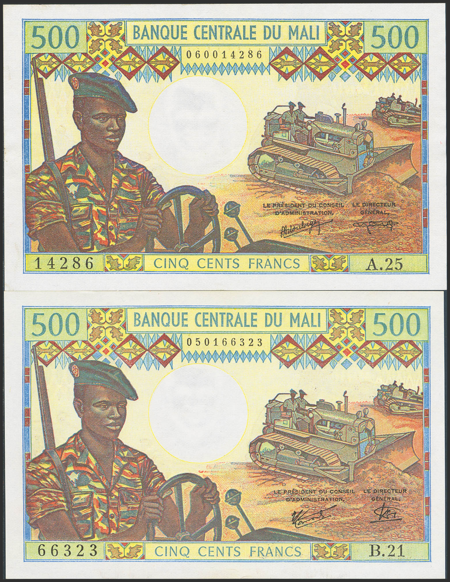 English MALI. Lot of 2 notes of 500 Francs. (1984ca). Central Bank. (Pick: 12e, 12f). Uncirculated and Almost Uncirculated.