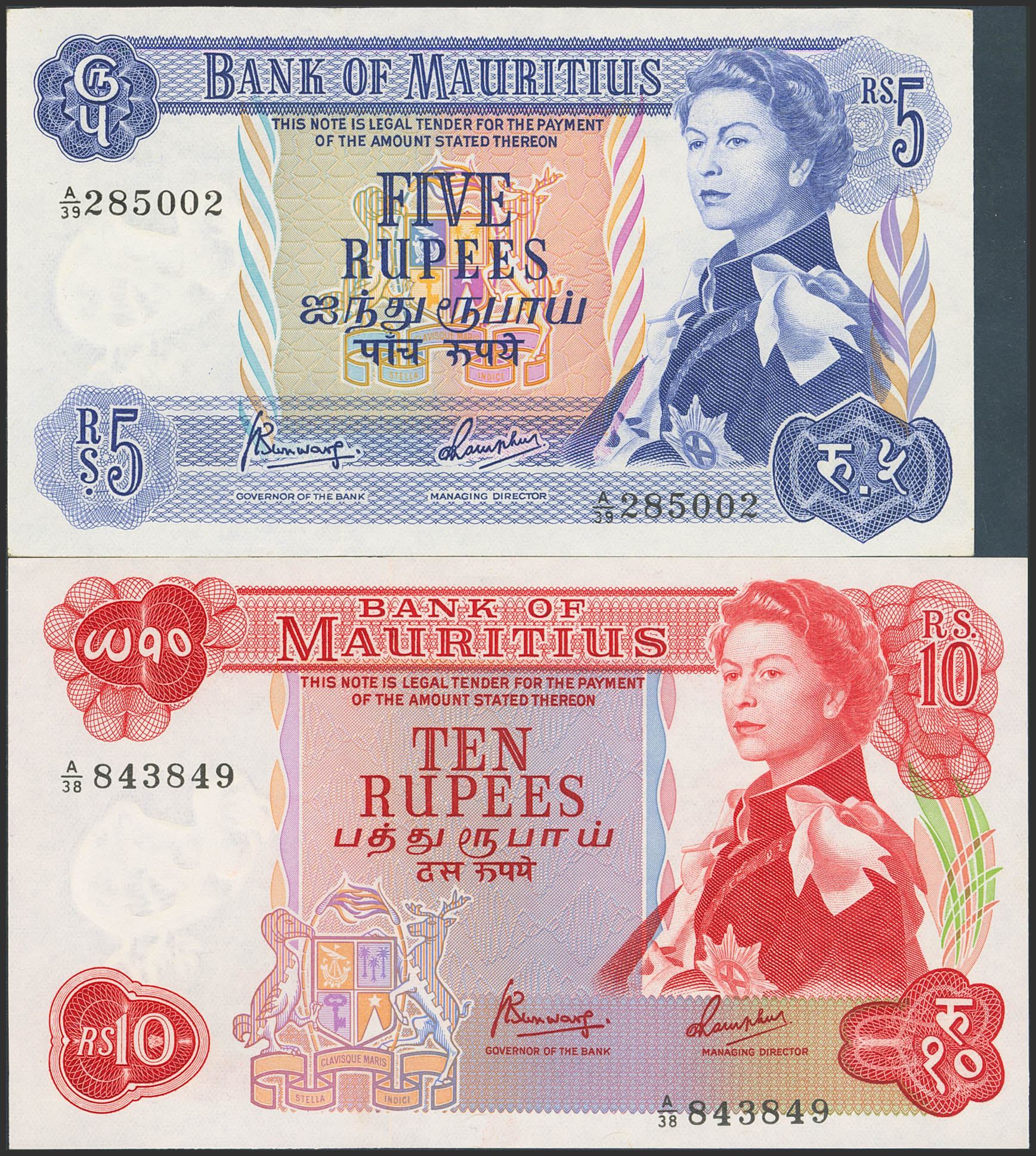 MAURITIUS. Lot of 2 notes of 5 and 10 Rupees. (1967ca). Bank of Mauritius. (Pick: 30c, 31c). Almost Uncirculated and Less than Uncirculated.