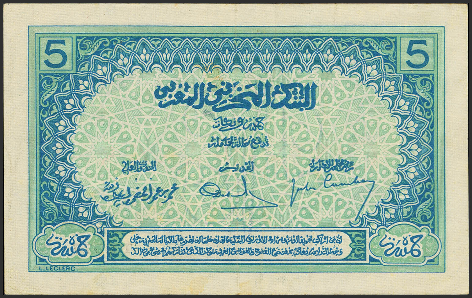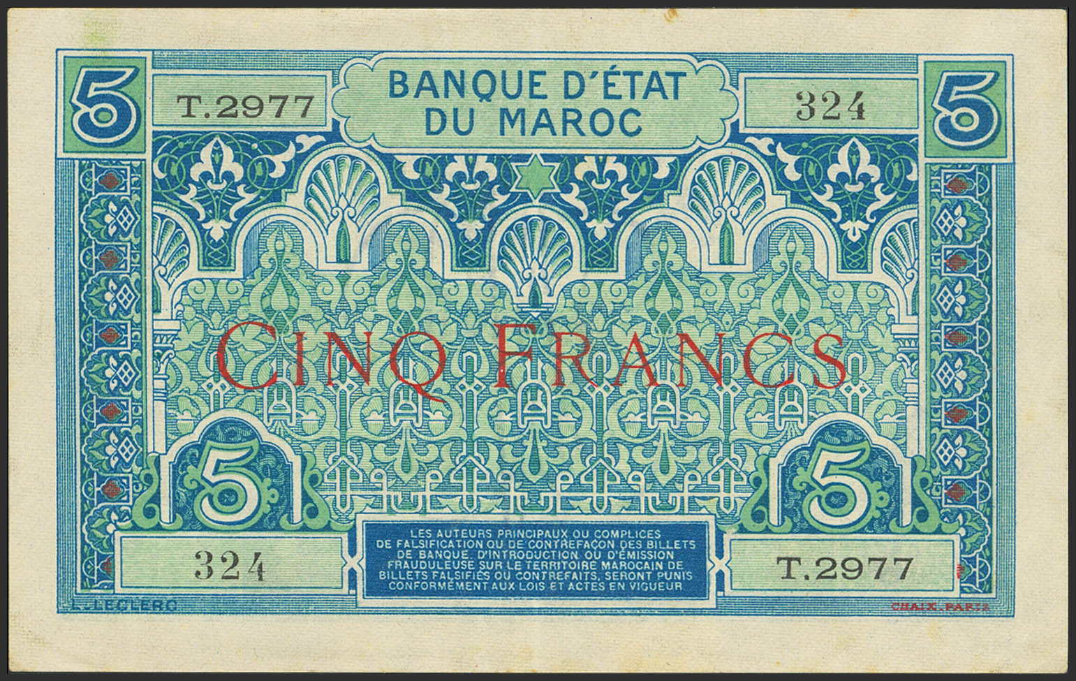 MOROCCO. 5 French. (1924ca). Banque d'Etat du Maroc. (Pick: 9). Extremely Fine.