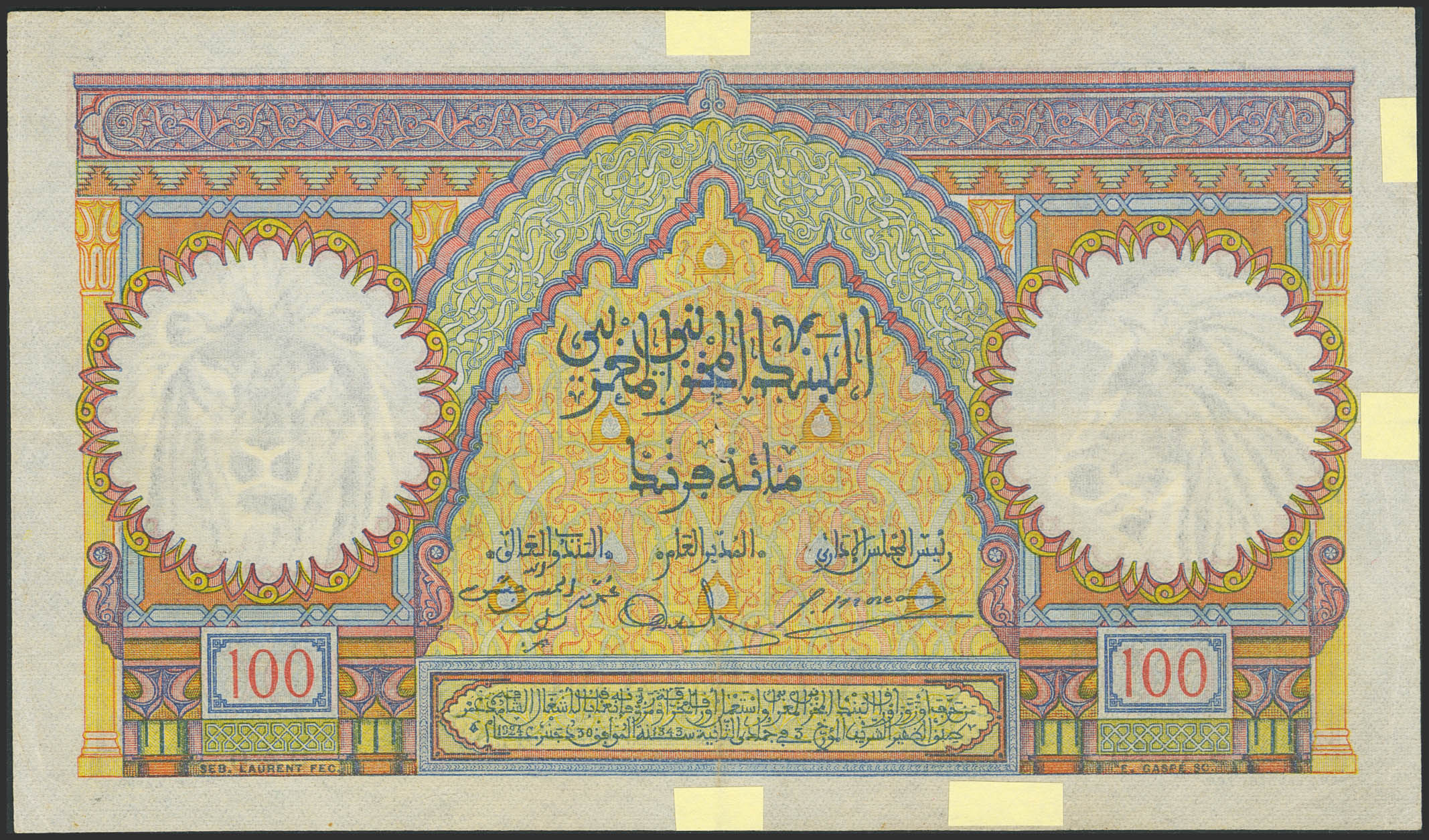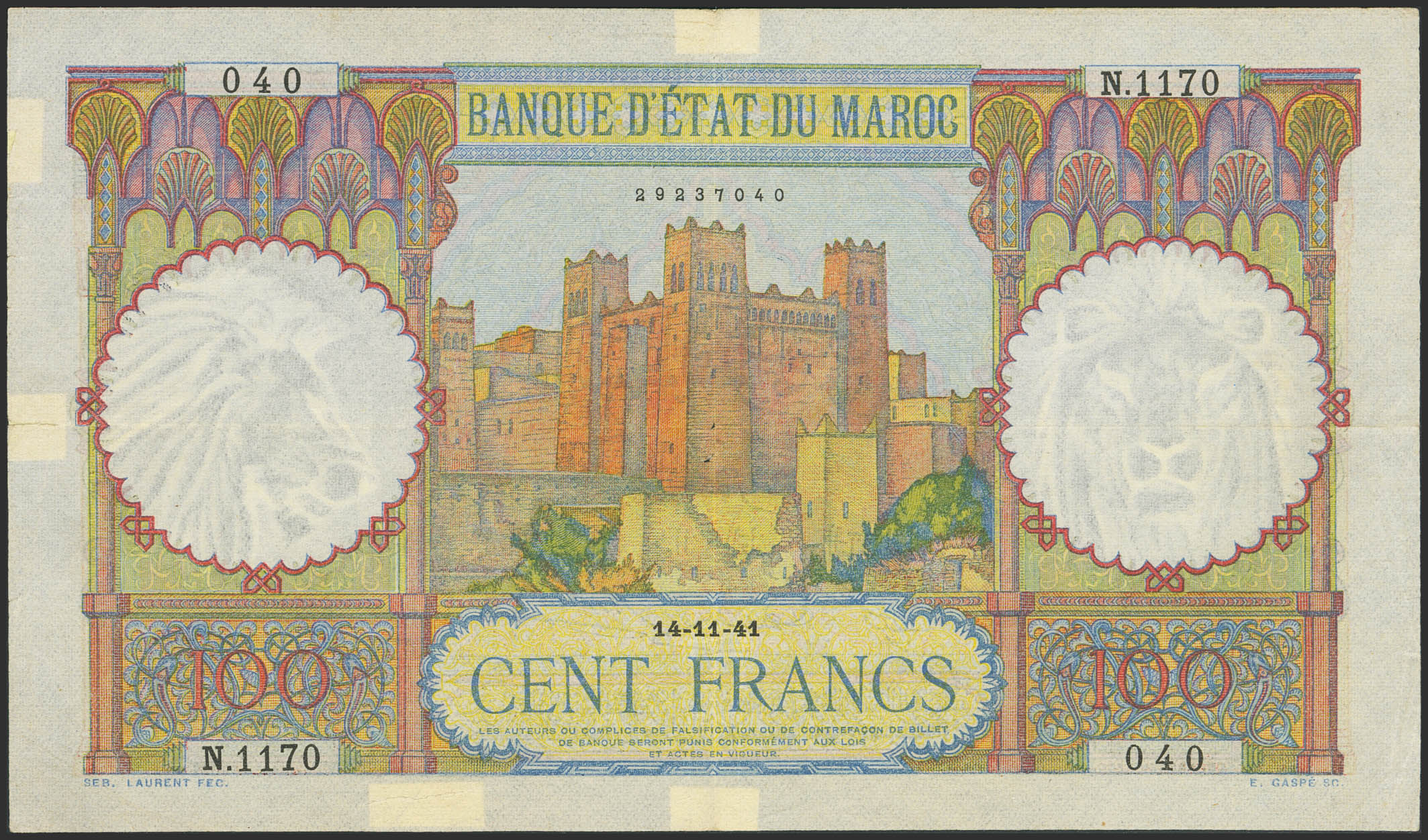 MOROCCO. 100 Francs. 14 November 1941. Banque d'Etat du Maroc. (Pick: 20). Removable adhesive tape. Very Fine.