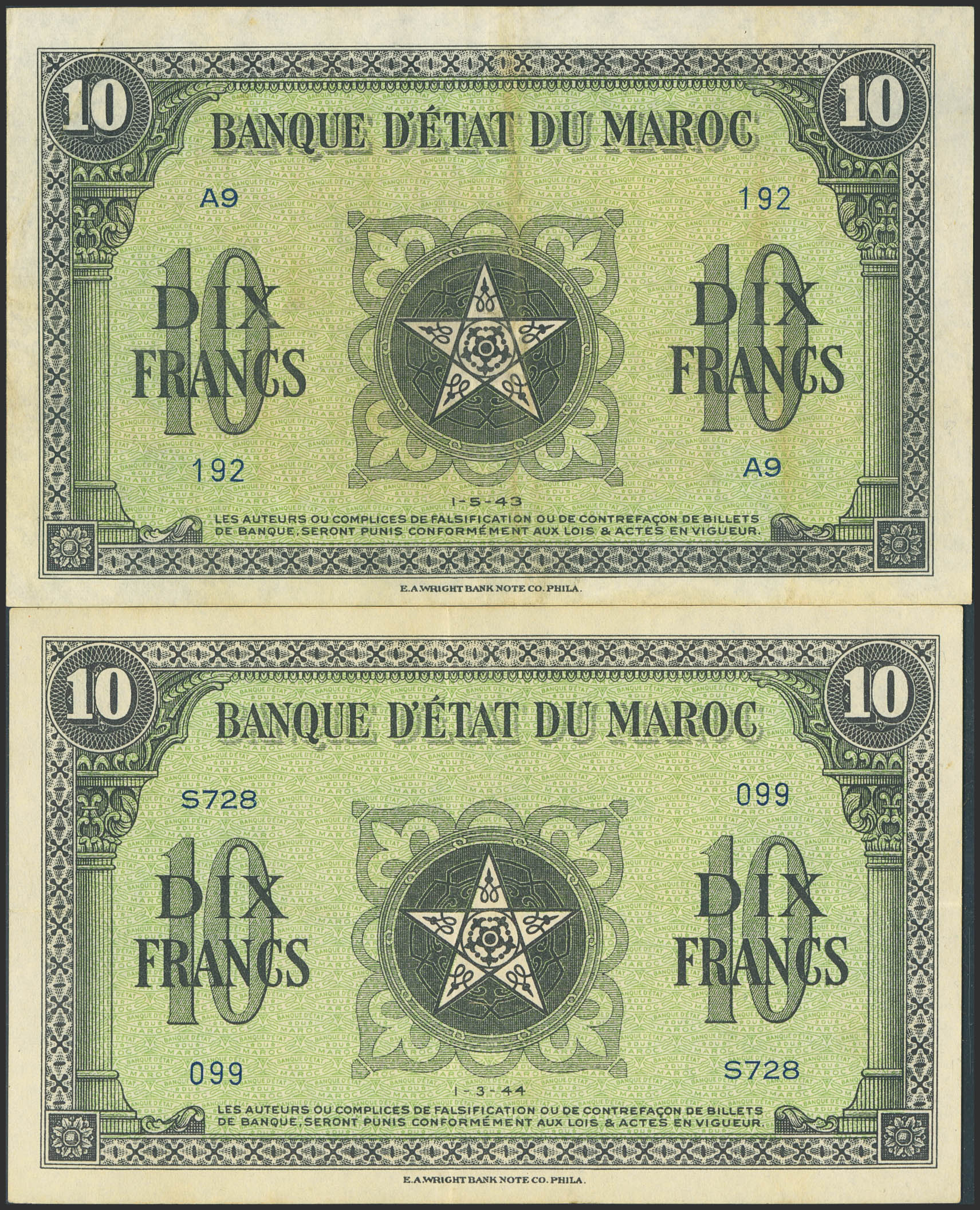 MOROCCO. 10 French. 1 May 1943 and 1 March 1944. Banque d'Etat du Maroc. (Pick: 25). More than Very Fine and Extremely Fine.
