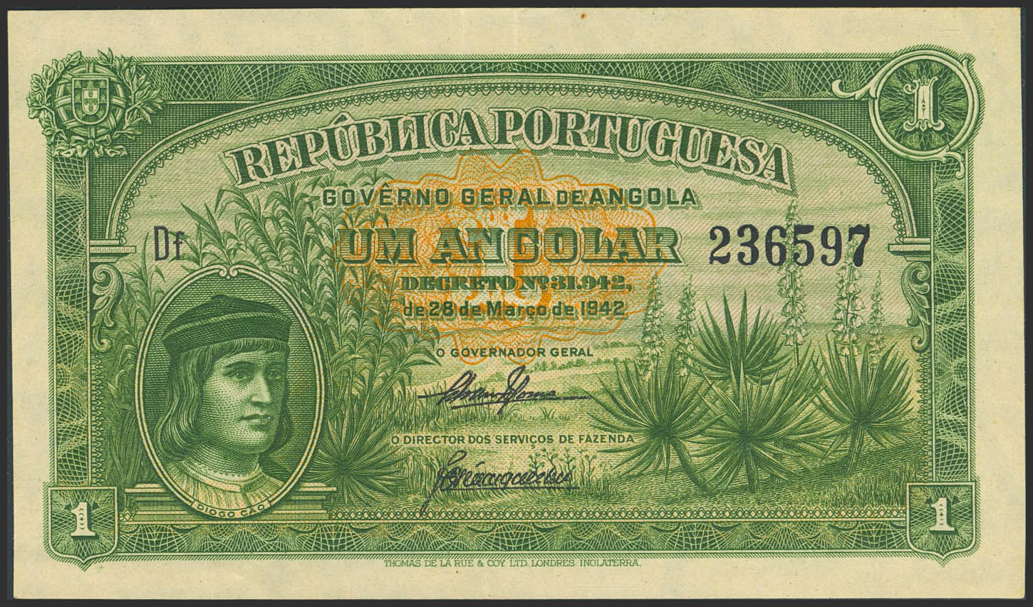 ANGOLA. 1 Angolar. March 28, 1942. General Government of Angola. (Pick: 68). More than Extremely Fine.