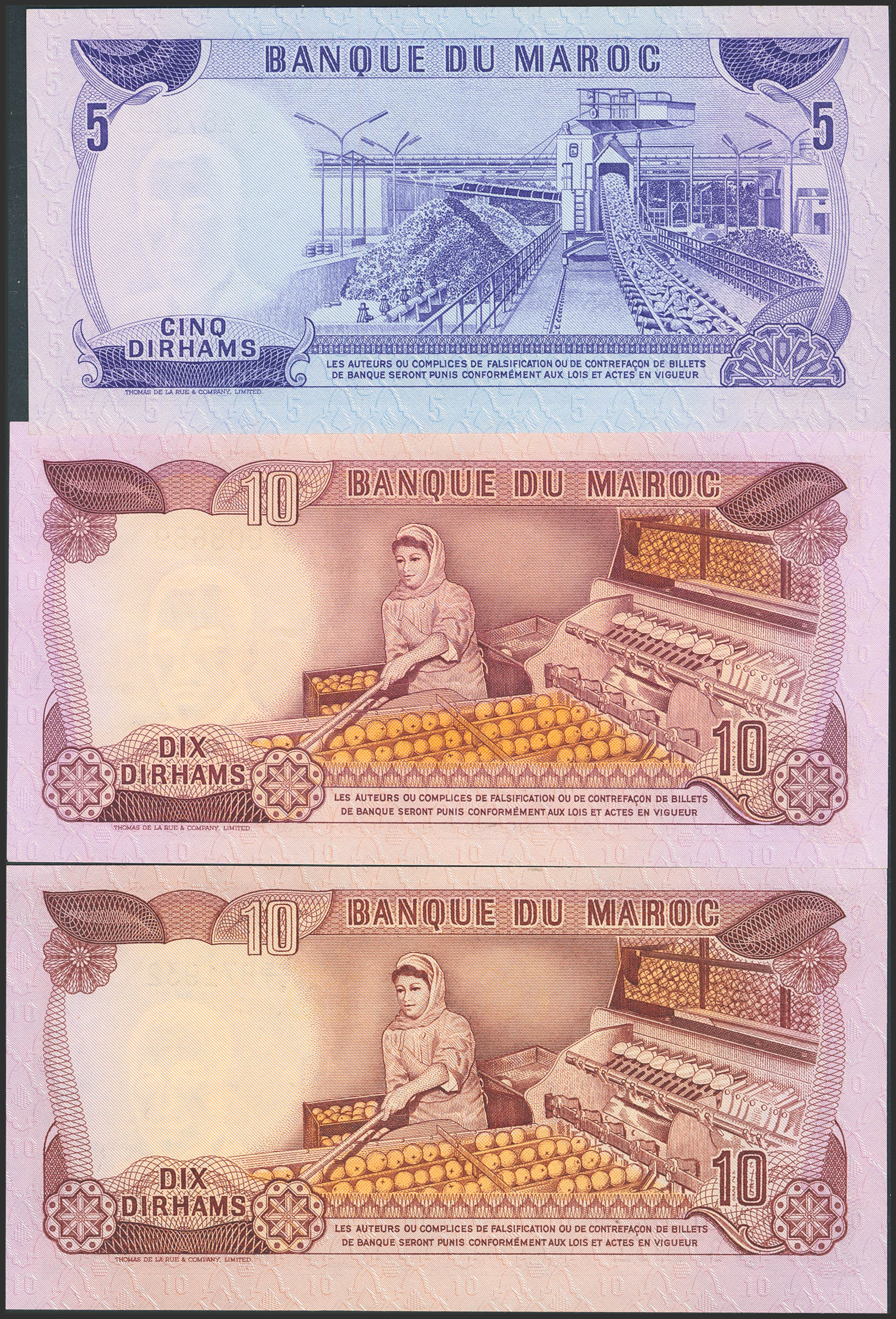 English MOROCCO. Lot of 3 notes of 5 and 10 Dirhams. 1970 and 1985. Banque du Maroc. (Pick: 56a, 57a, 57b). Uncirculated.
