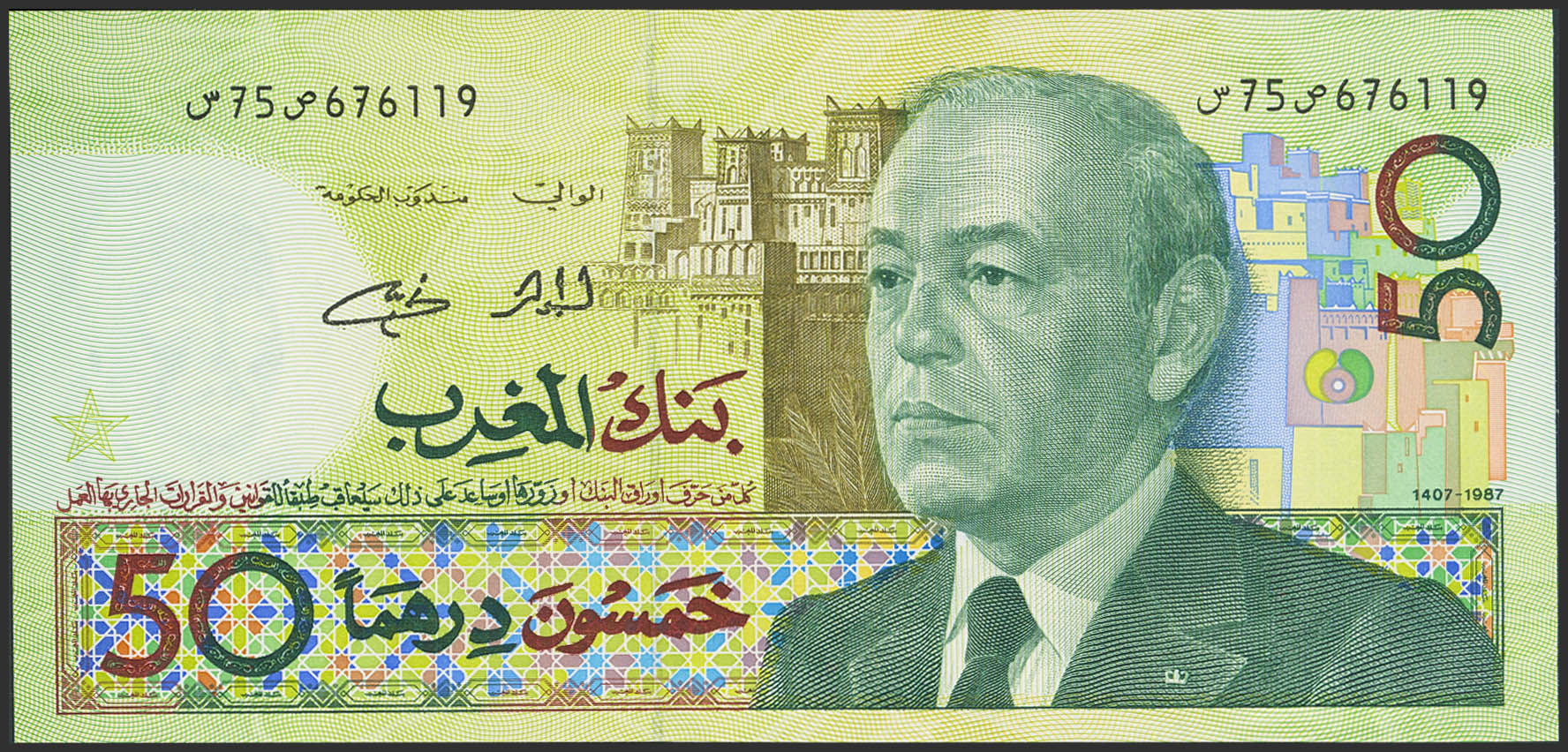 MOROCCO. 50 Dirhams. 1987. Bank Al-Maghrib. (Pick: 64e). Less than Uncirculated.