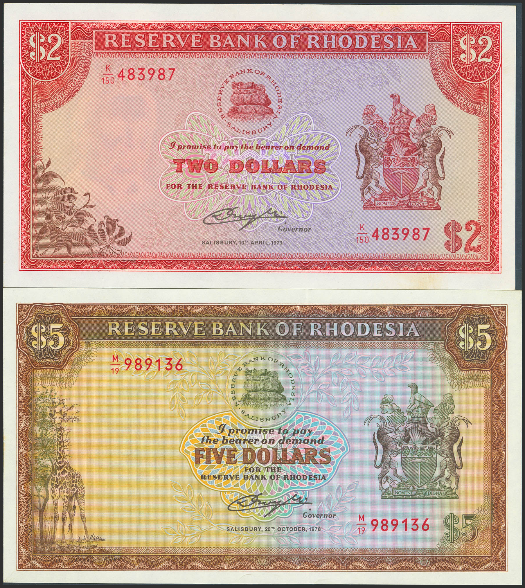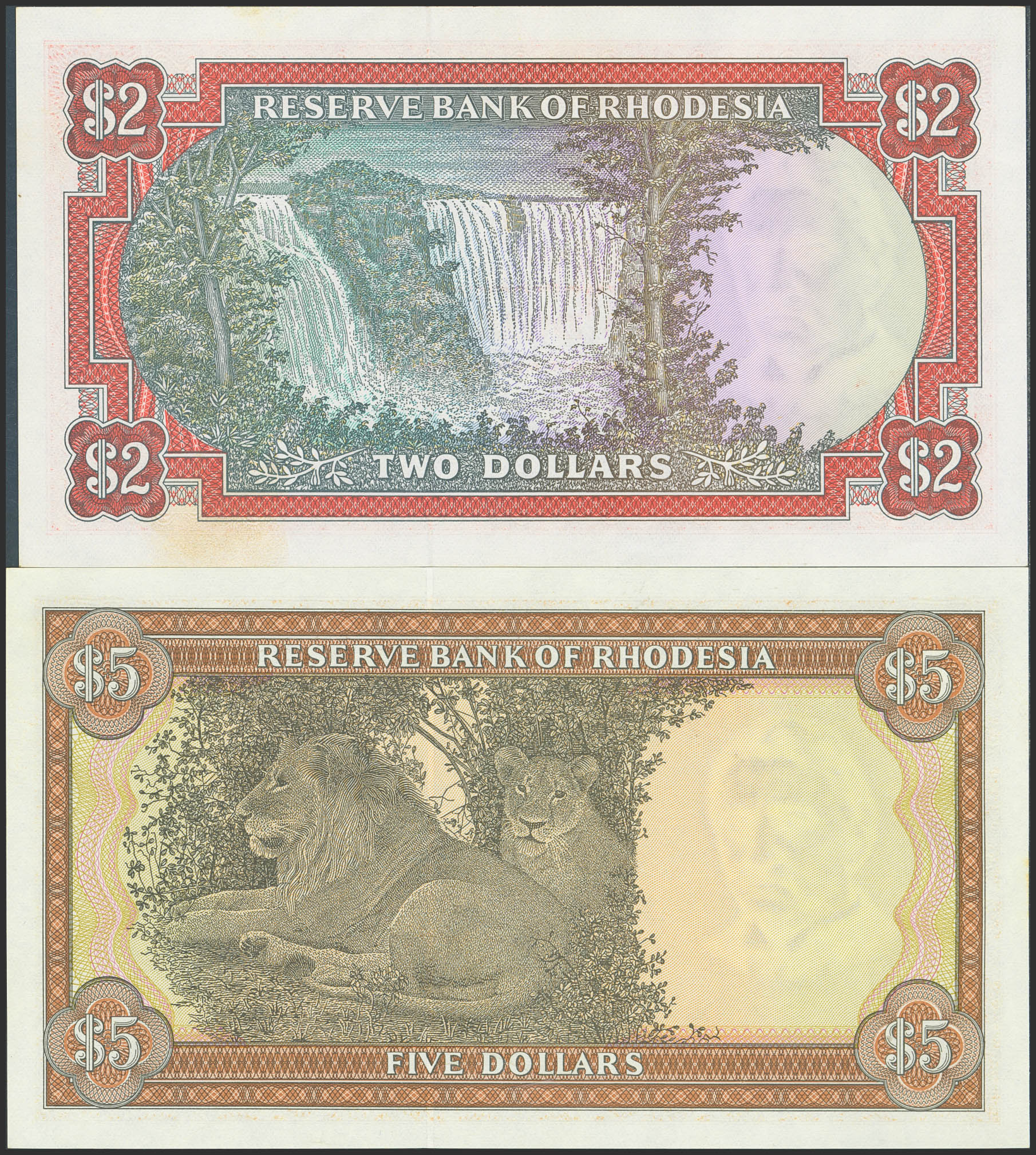 English RHODESIA. Lot of 2 notes of 2 and 5 Dollars. 1978 and 1979. Reserve Bank. Watermark Cecil Rhodes. (Pick: 35d, 36b). Less than Uncirculated and Uncirculated (P36b).