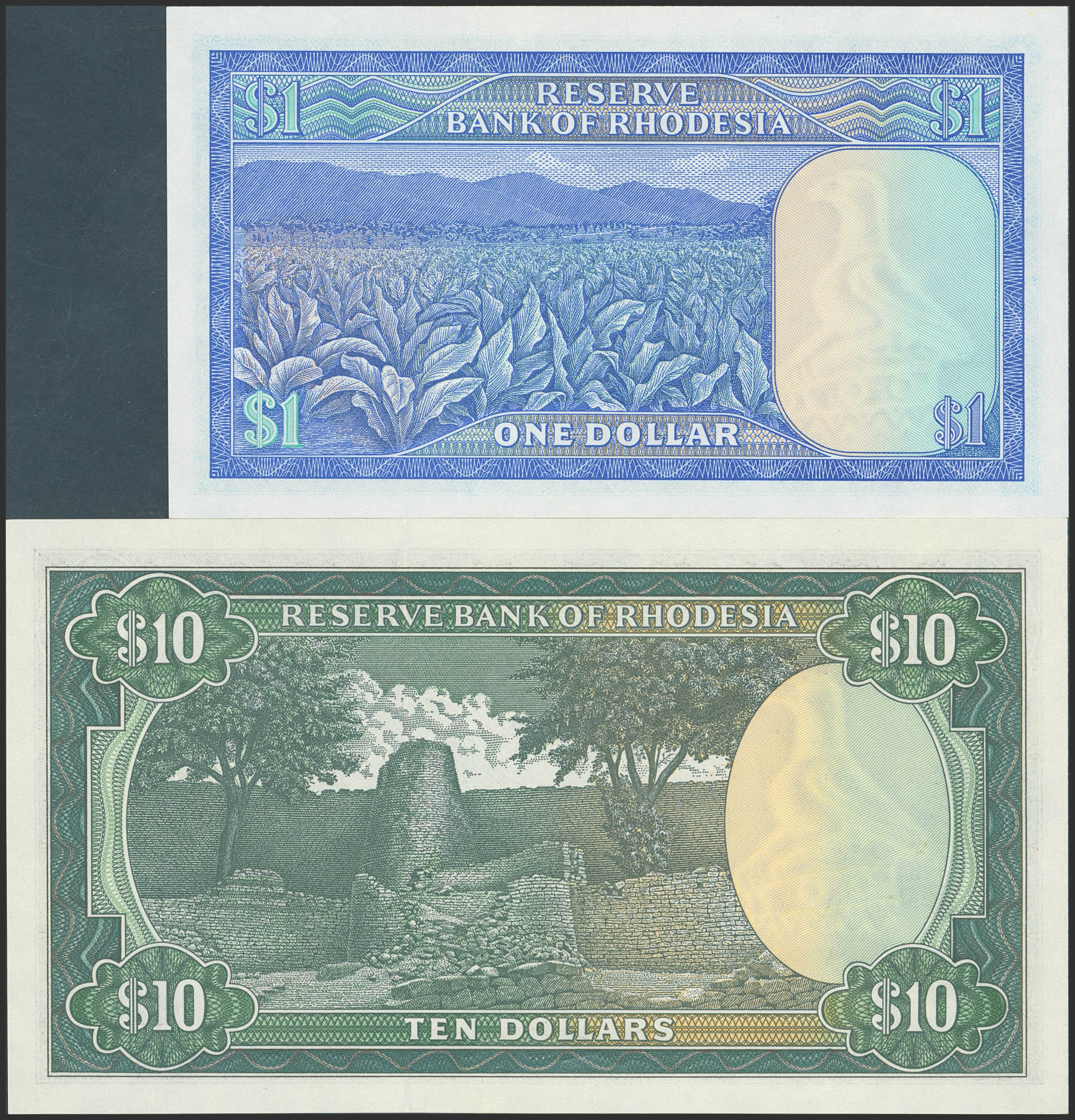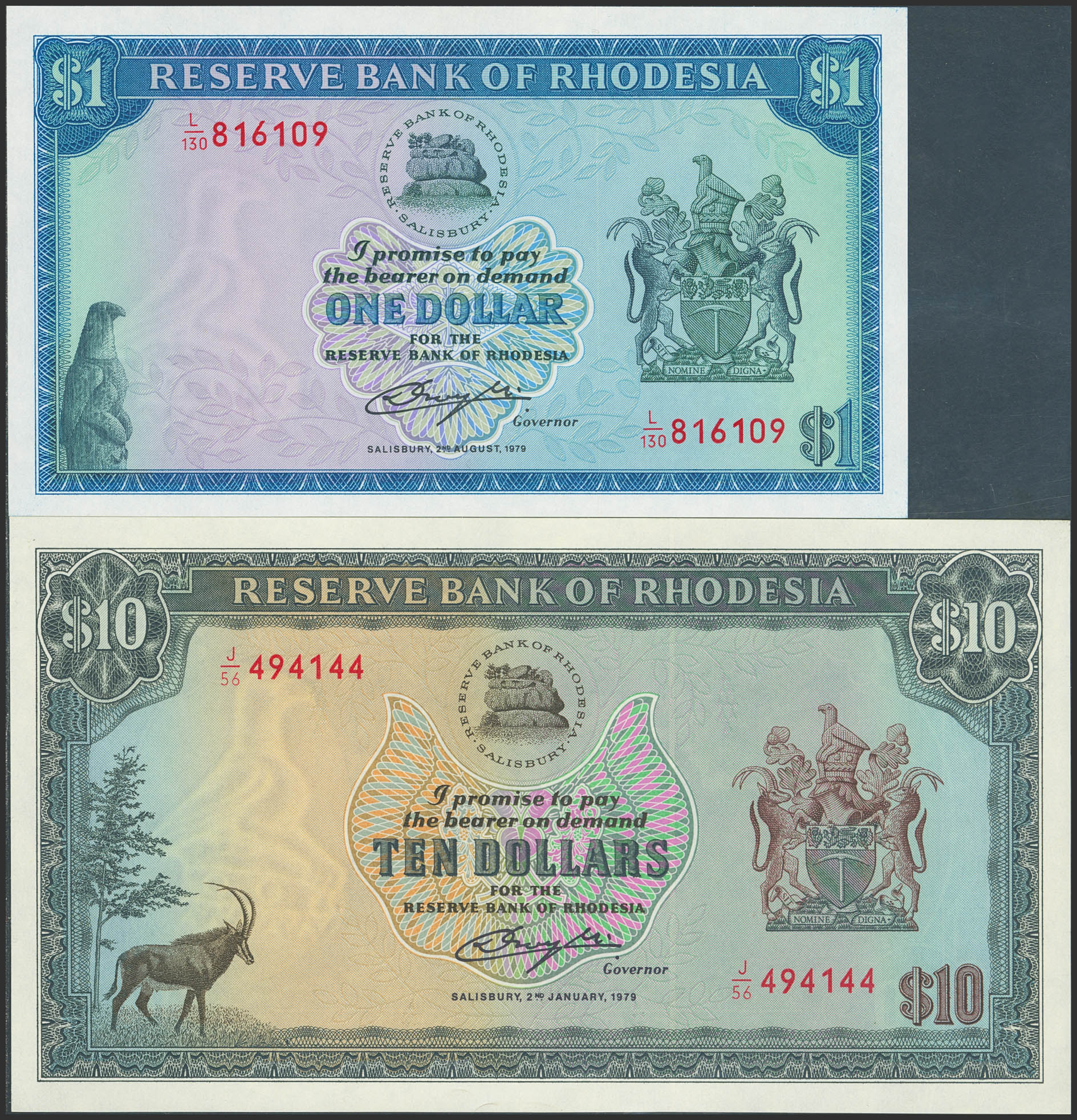 English RHODESIA. Lot of 2 notes of 1 and 10 Dollars. 1979. Reserve Bank. Watermark Zimbabwe bird. (Pick: 38, 41a). Uncirculated.