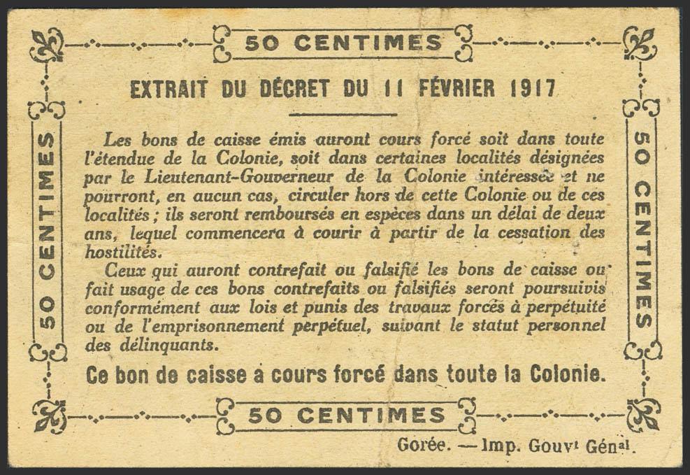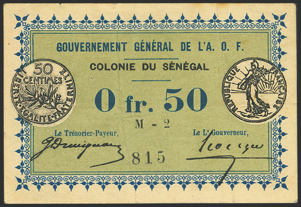 SENEGAL. 0'50 Franc. 11 February 1917. Gouvernement General de l'Afrique Occidentale Francaise. Colonie Du Senegal. (Pick: 1c). 5 pinholes. More than Very Fine.