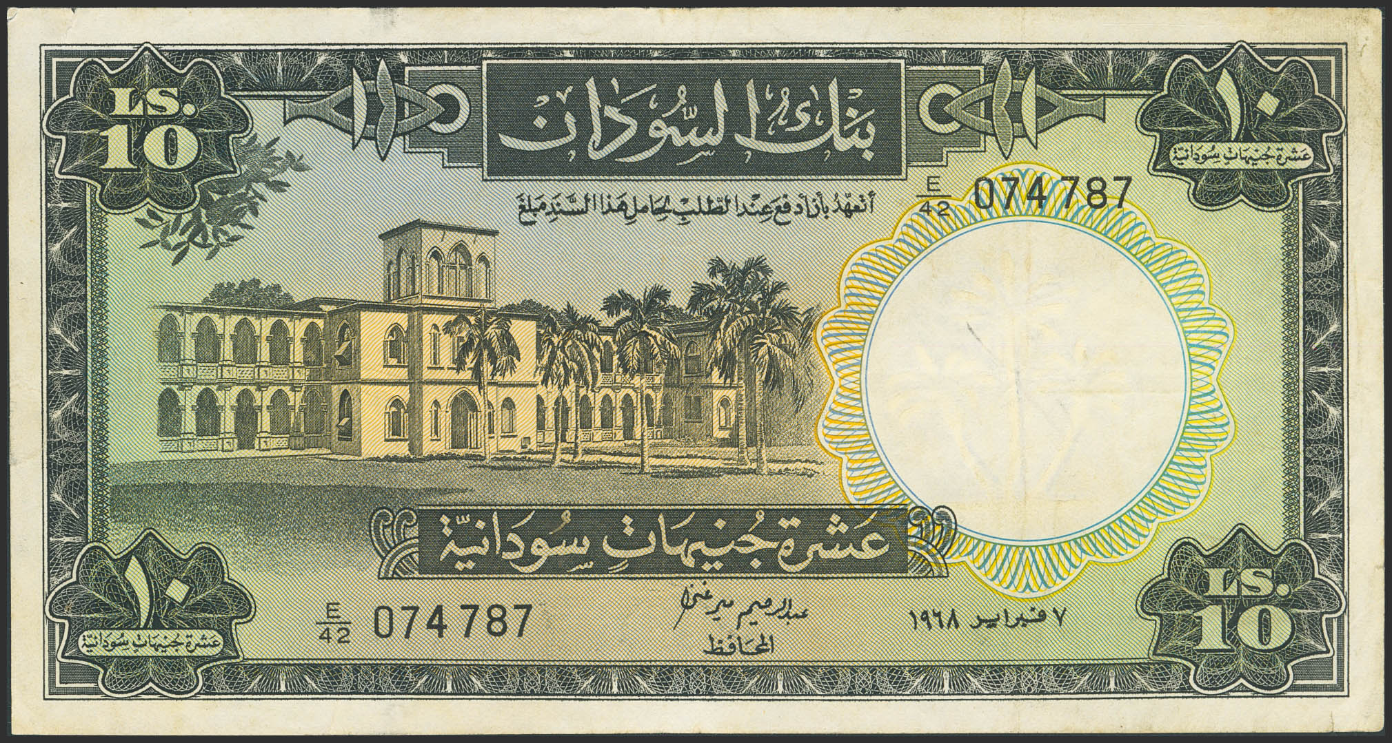 SUDAN. 10 Sudanese Pounds. 1968. Bank of Sudan. (Pick: 10d). Restored left edge. More than Very Fine.