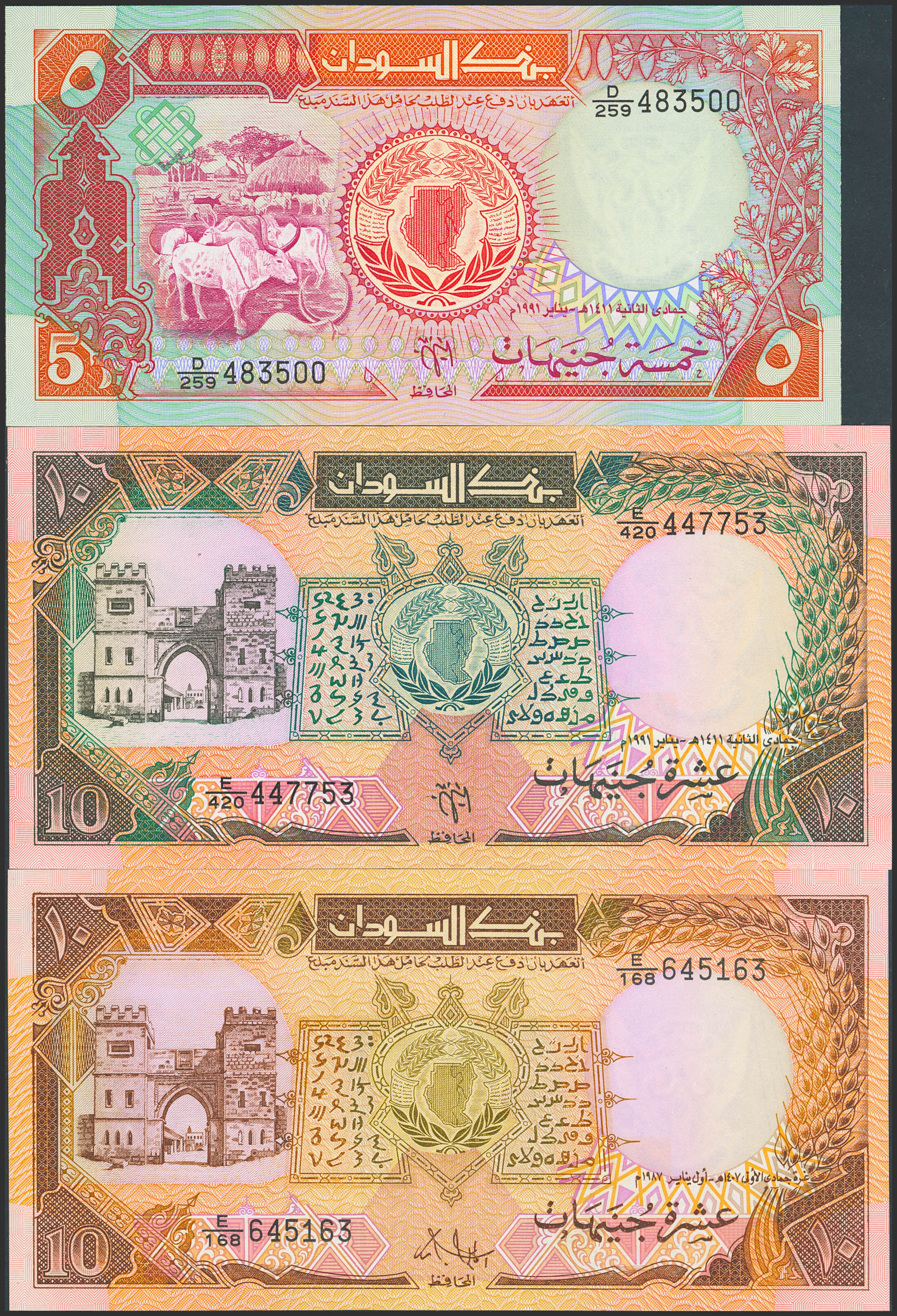 English SUDAN. Lot of 3 notes of 5 and 10 Sudanese Pounds. 1987 and 1991. Bank of Sudan. (Pick: 41a, 45, 46). Uncirculated.