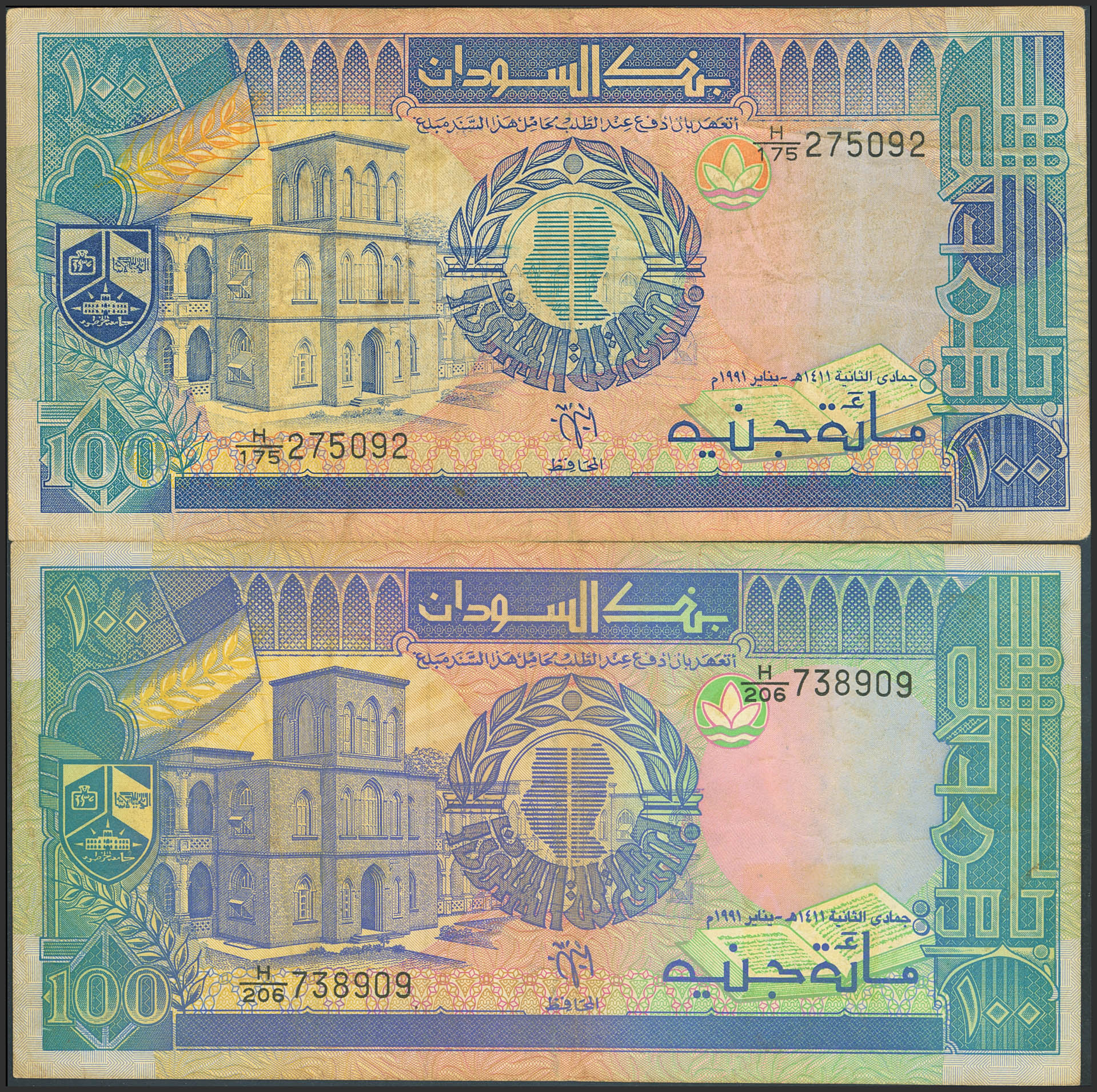 SUDAN. Lot of 2 notes of 100 Sudanese Pounds. 1991. Bank of Sudan. Dark and light building. (Pick: 49, 50). Very Fine and More than Very Fine.