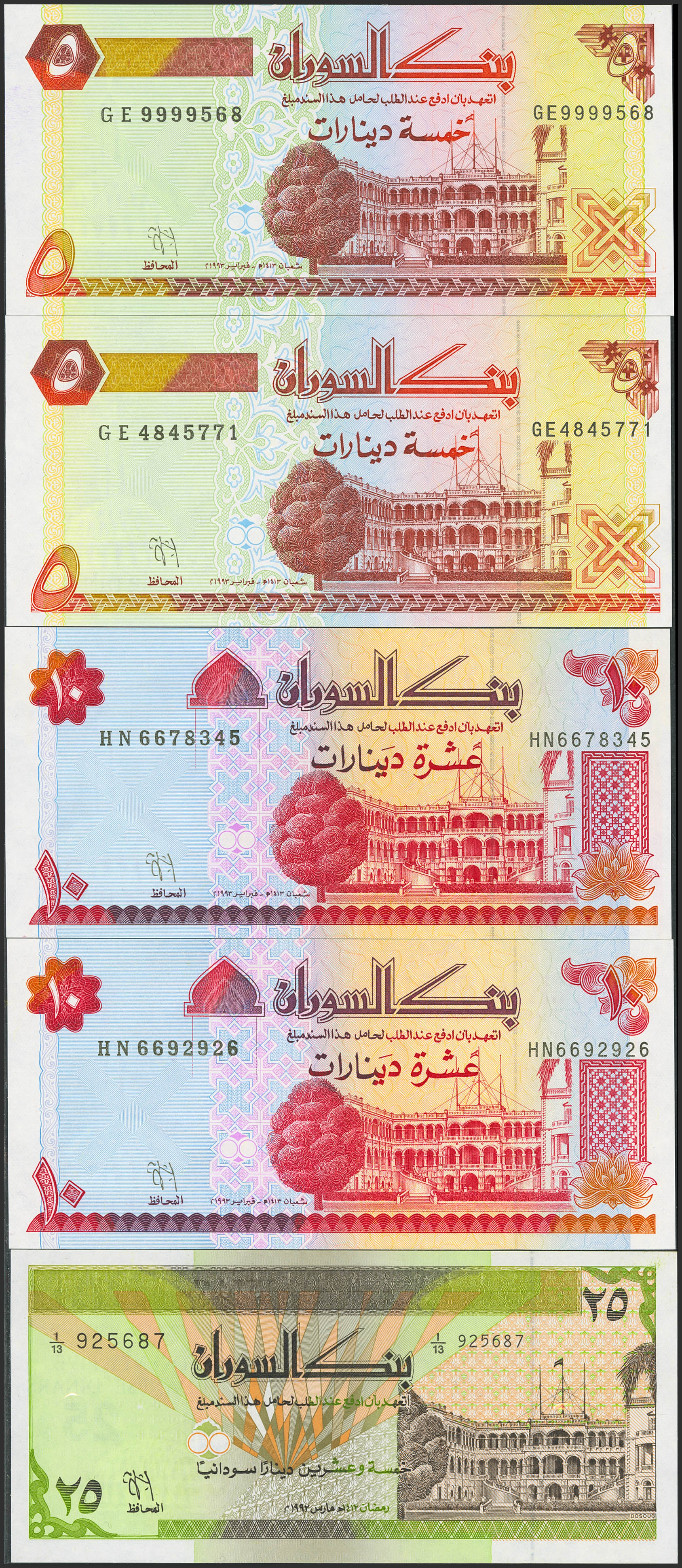 SUDAN. Lot of 10 notes from 5 to 100 Sudanese Dinars. 1992 to 1994. Bank of Sudan. (Pick: 51a(2), 52a(2), 53a, 53b, 54b, 54d, 55a, 56a). Uncirculated.