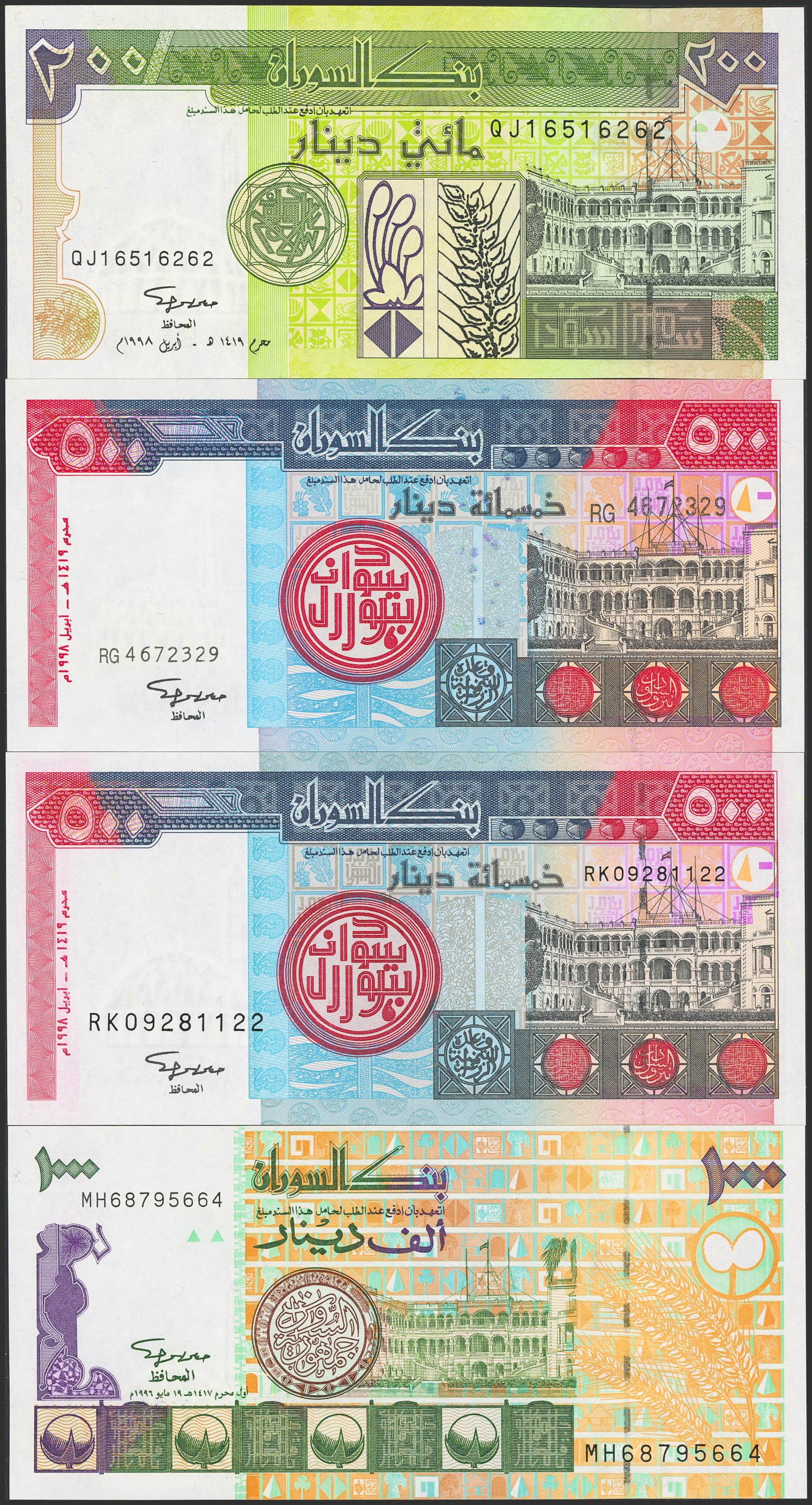English SUDAN. Lot of 4 notes from 200 to 1000 Sudanese Dinars. 1996 and 1998. Bank of Sudan. (Pick: 57a, 58a, 58b, 59a). Uncirculated.
