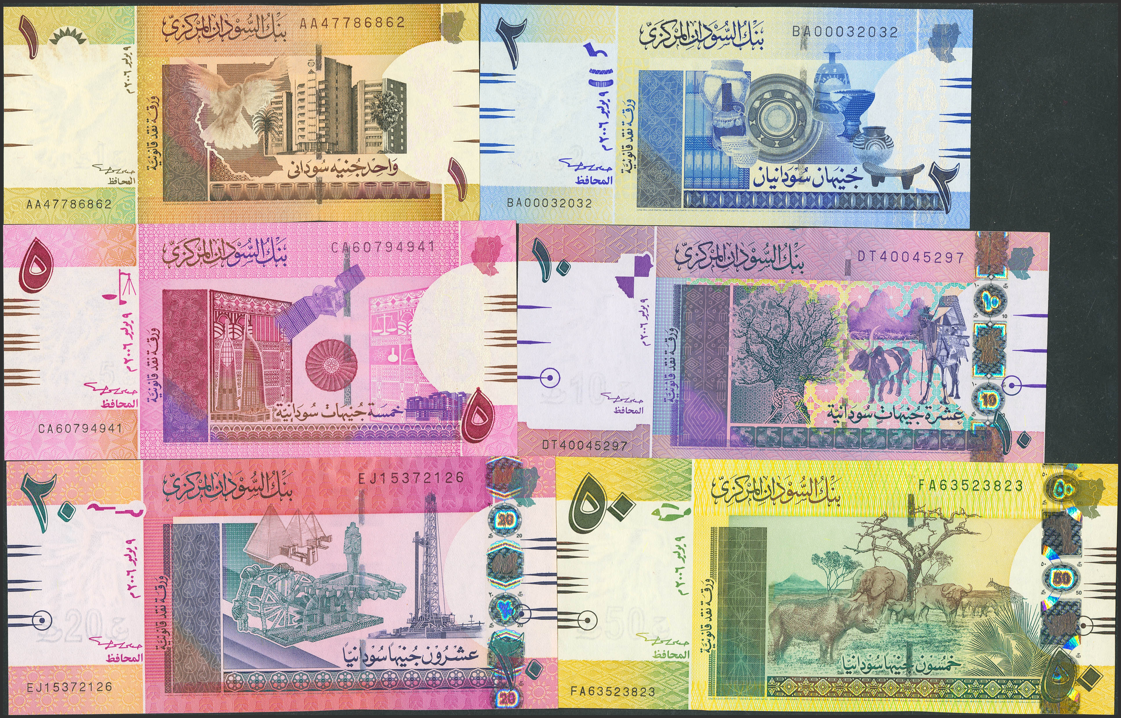 SUDAN. Complete set of 6 notes from 1 to 50 Pounds. 2006. Central Bank. (Pick: 64a, 65a, 66a, 67a, 68a, 69). Uncirculated.