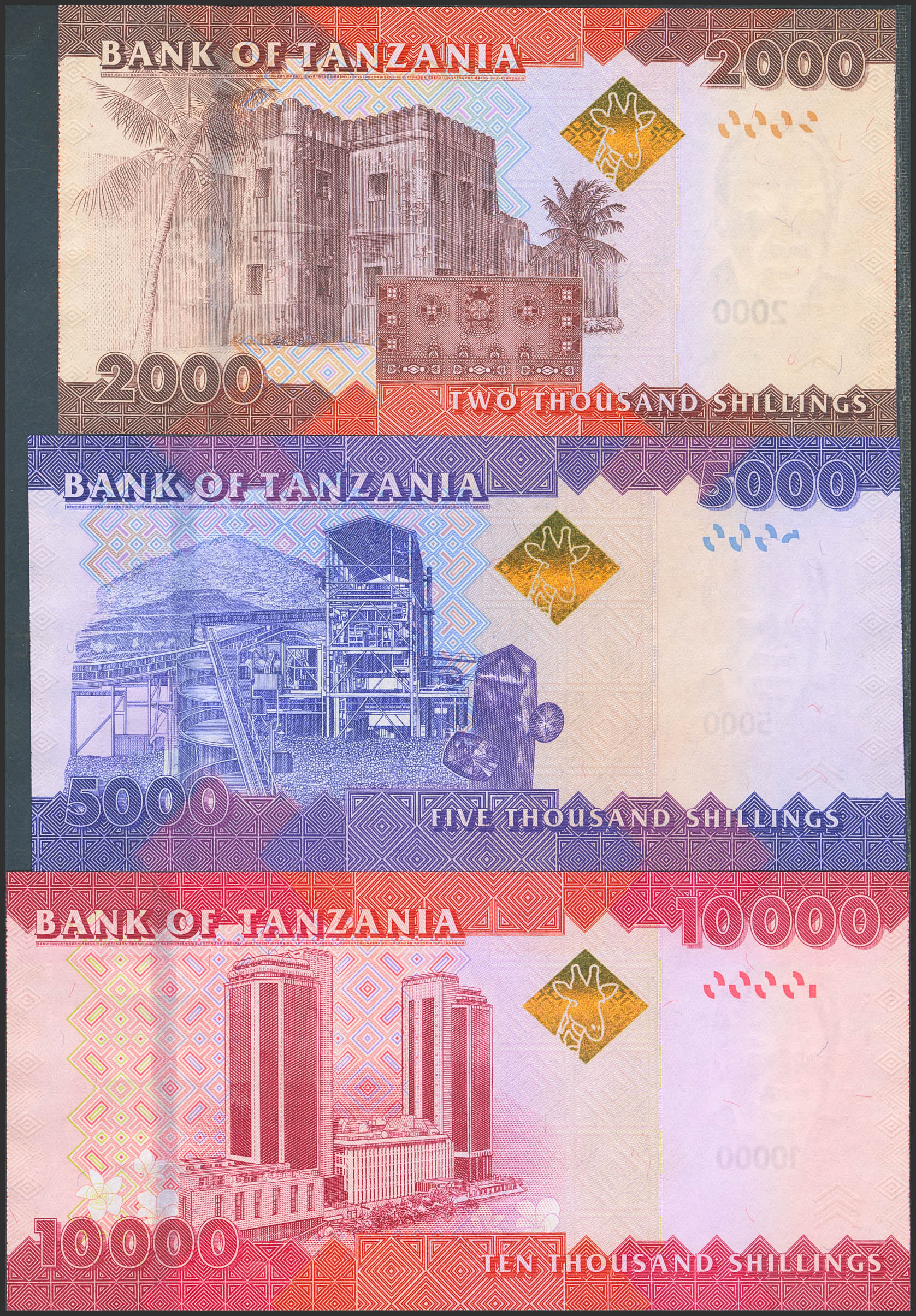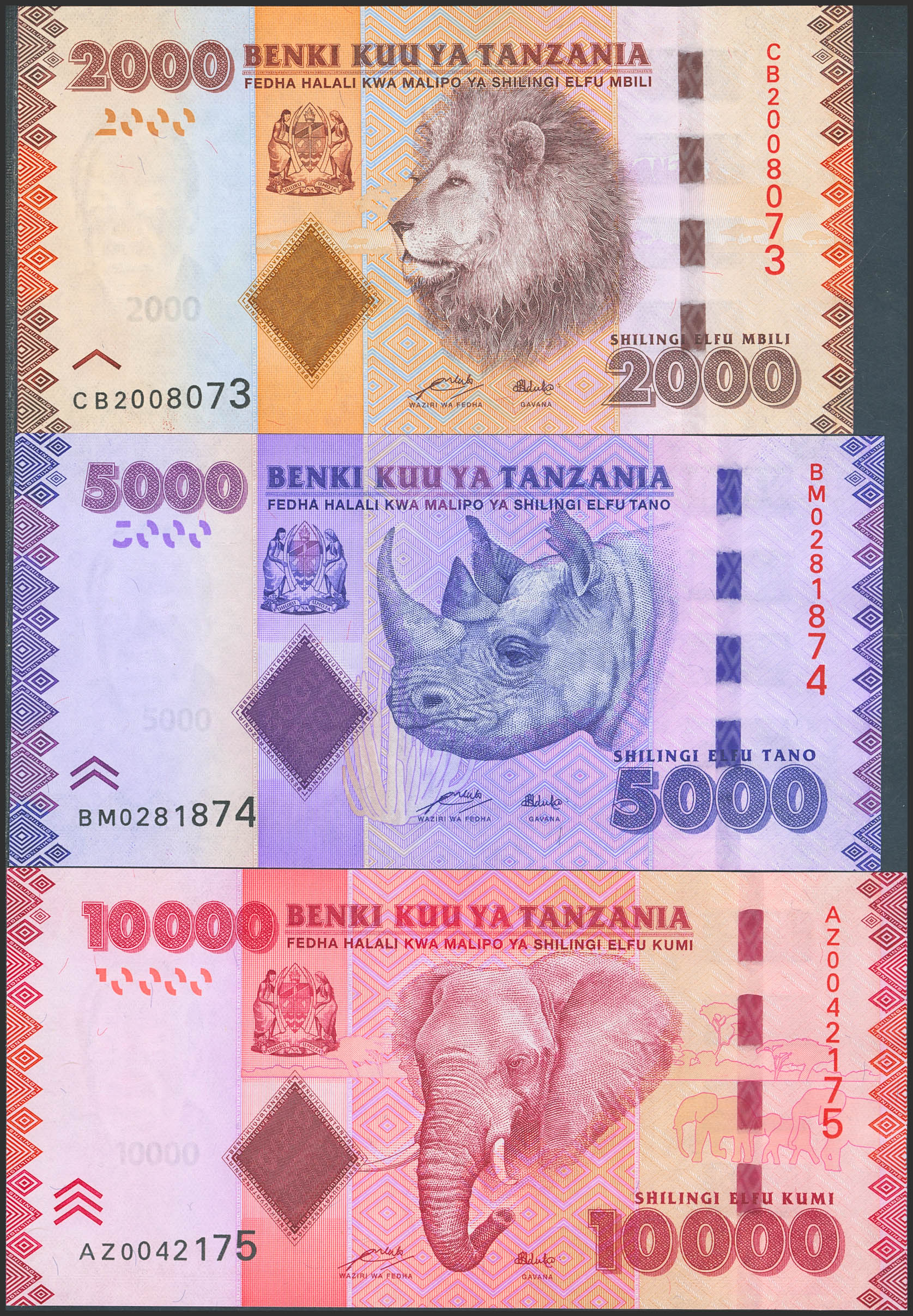 TANZANIA. Lot of 3 notes of 2000, 5000 and 10000 Shillings. (2010ca). Central Bank. (Pick: 42a, 43a, 44a). Uncirculated.