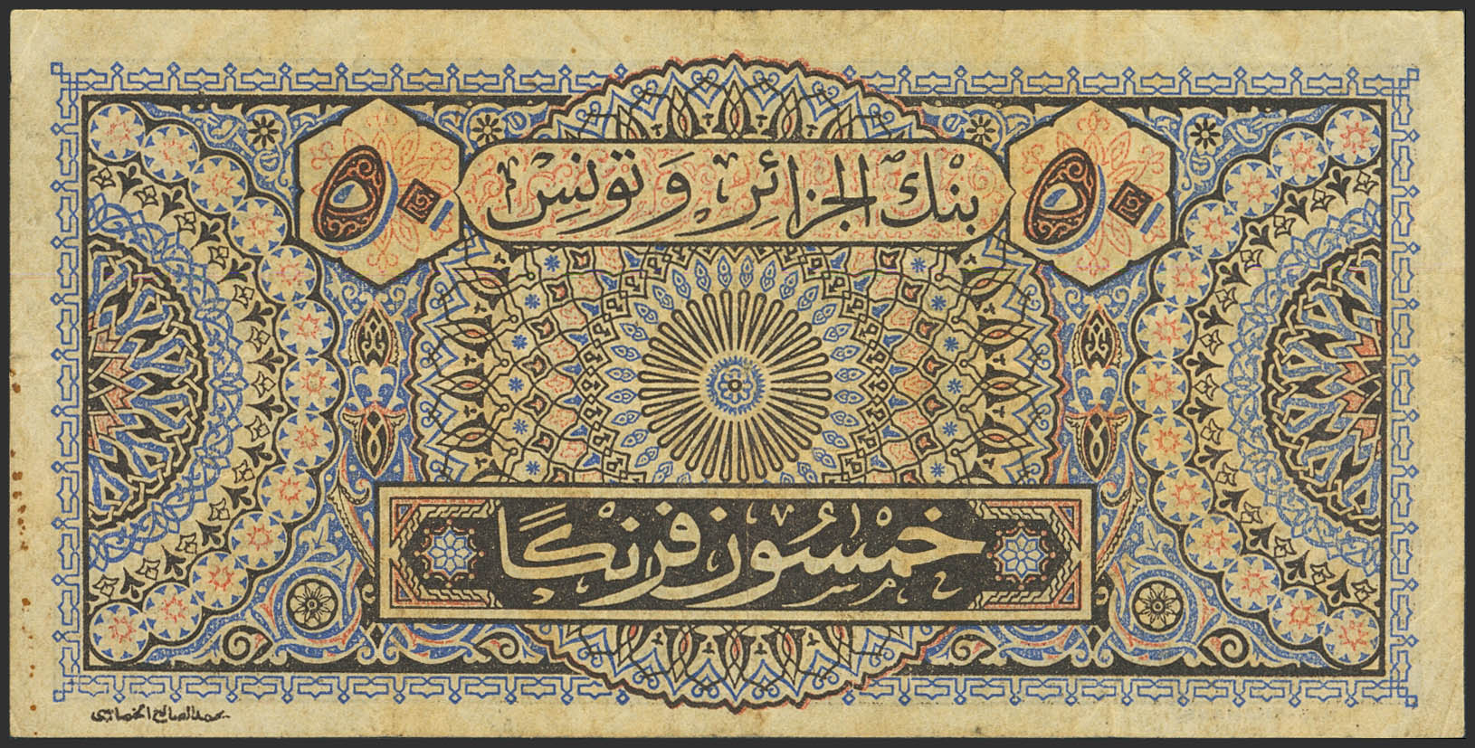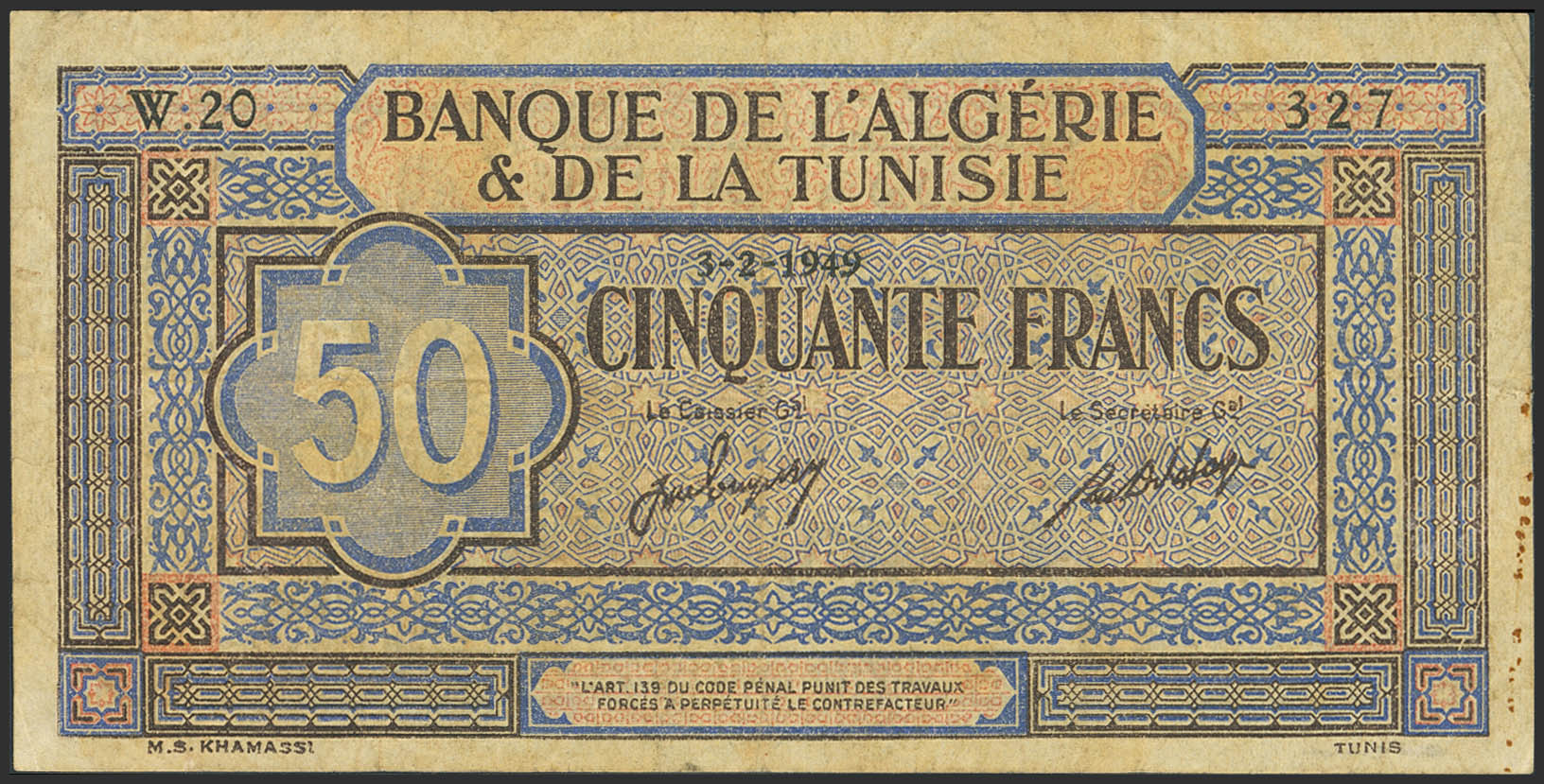 TUNISIA. 50 Francs. 3 February 1949. Banque de l'Algerie et de la Tunisie. (Pick: 23). Pinhole. Very Fine.