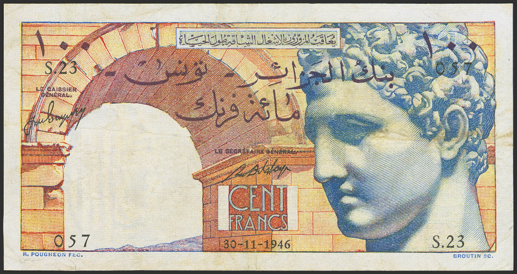 TUNISIA. 100 Francs. 30 November 1946. Banque de l'Algerie. Tunisie. (Pick: 24). Washed and flattened. Very Fine.
