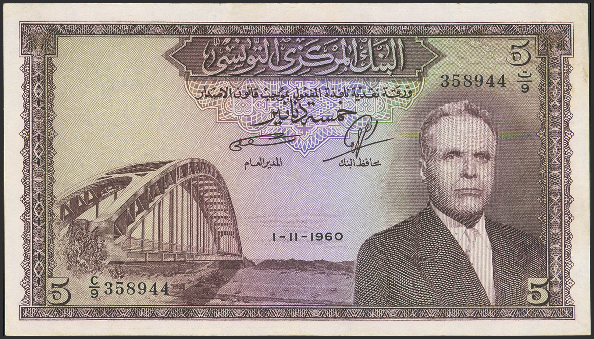 TUNISIA. 5 Dinars. 1 November 1960. Banque Centrale de Tunisie. (Pick: 60). Extremely Fine.