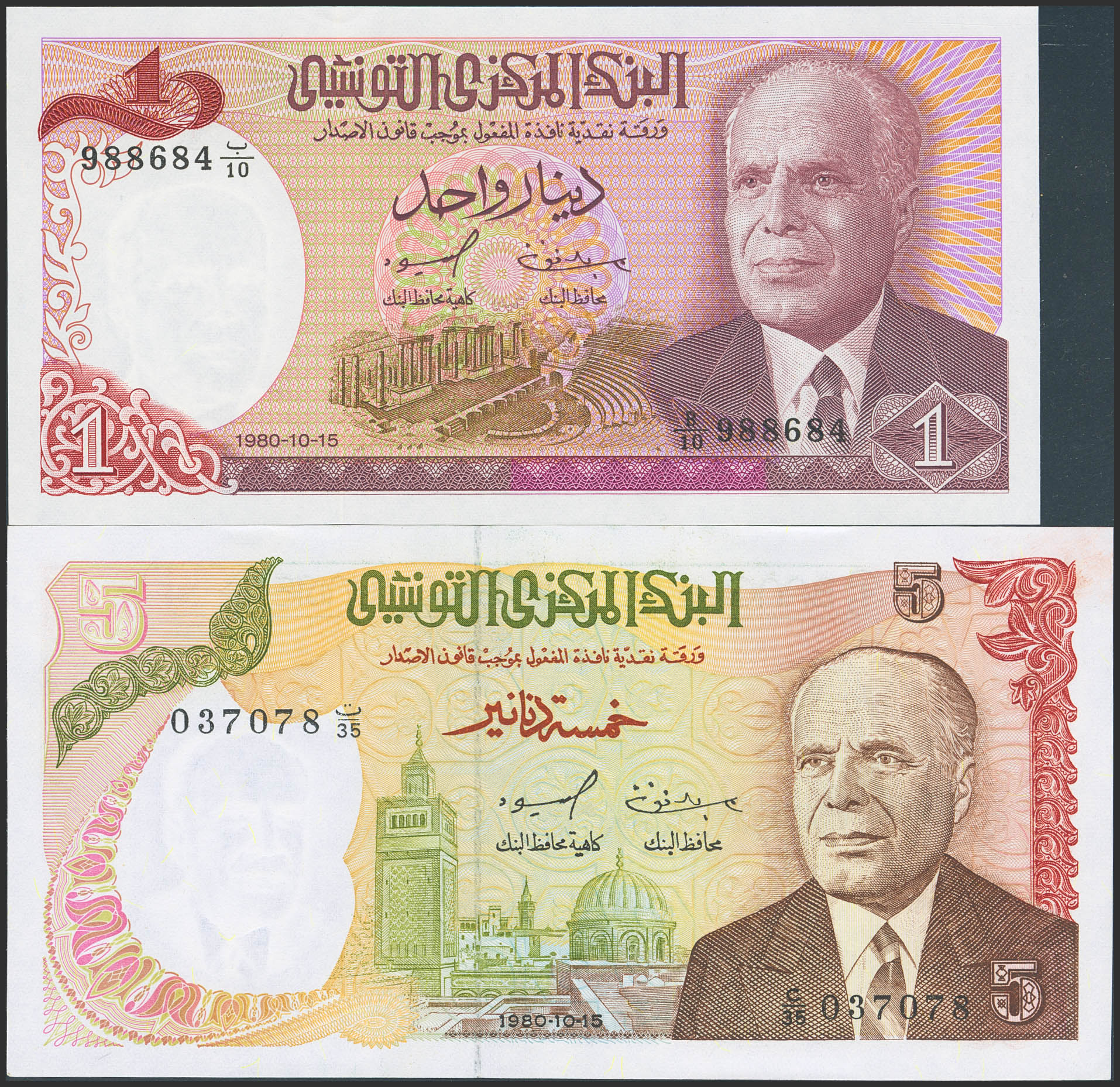 TUNISIA. Lot of 2 notes of 1 and 5 Dinars. 15 October 1980. Banque Centrale de Tunisie. (Pick: 74, 75). Uncirculated and Less than Uncirculated.