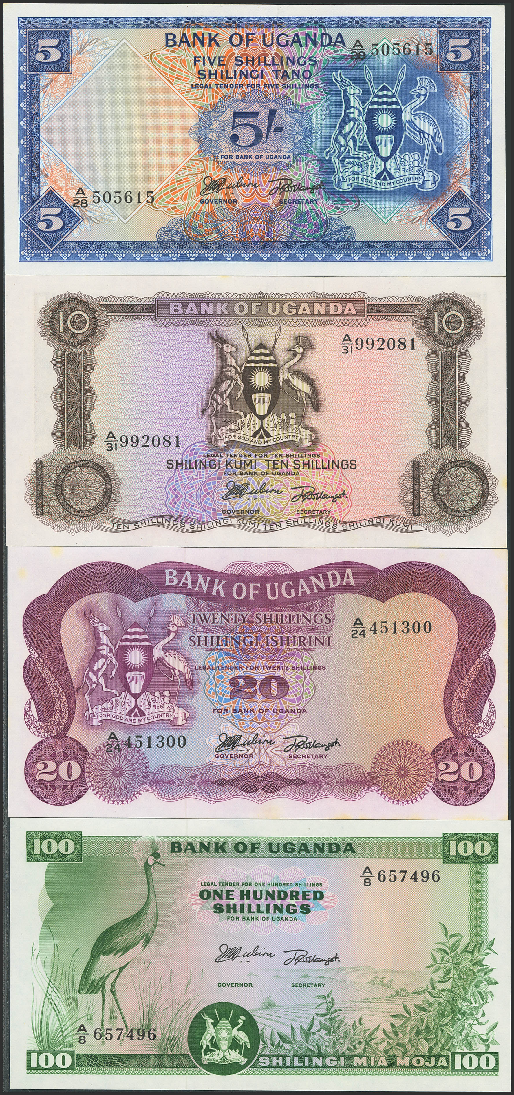 English UGANDA. Lot 4 notes from 5 to 100 Shillings. (1966ca). Bank of Uganda. (Pick: 1, 2, 3, 5). Uncirculated (2) and Less than uncirculated (2).