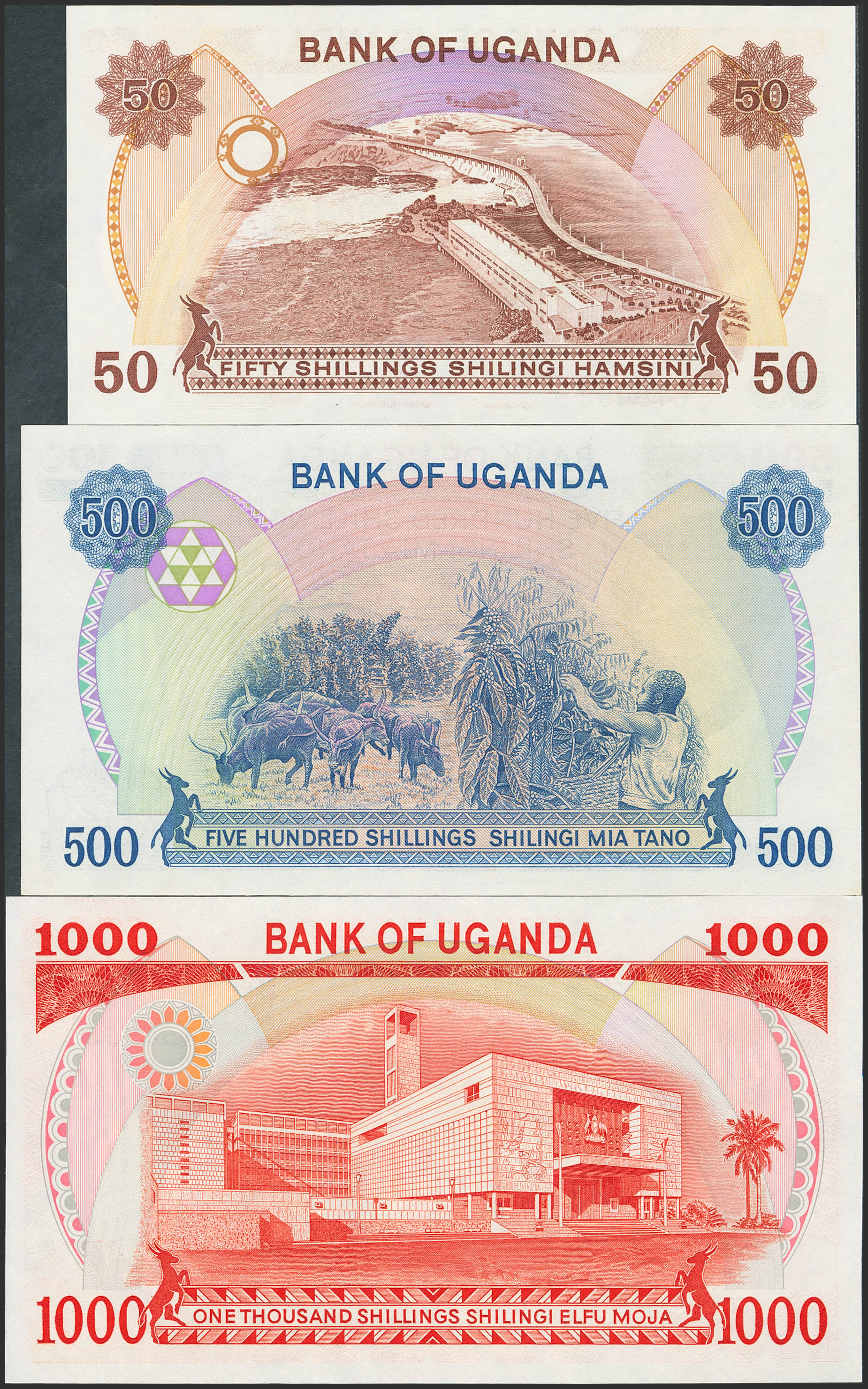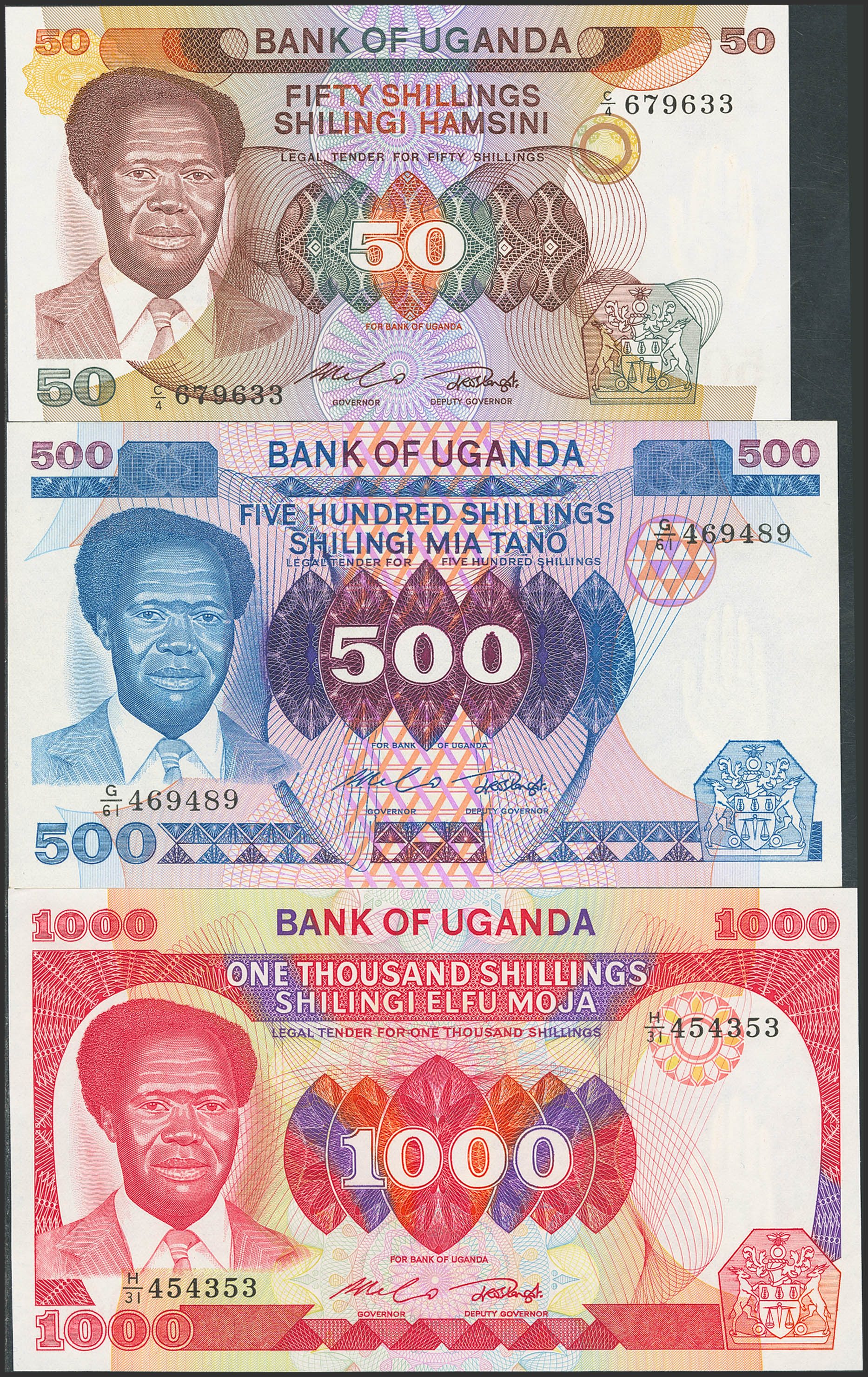 UGANDA. Lot of 3 notes of 50, 500 and 1000 Shillings. (1983ca). Bank of Uganda. (Pick: 20, 22, 23). Uncirculated (2) and Almost Uncirculated (1).