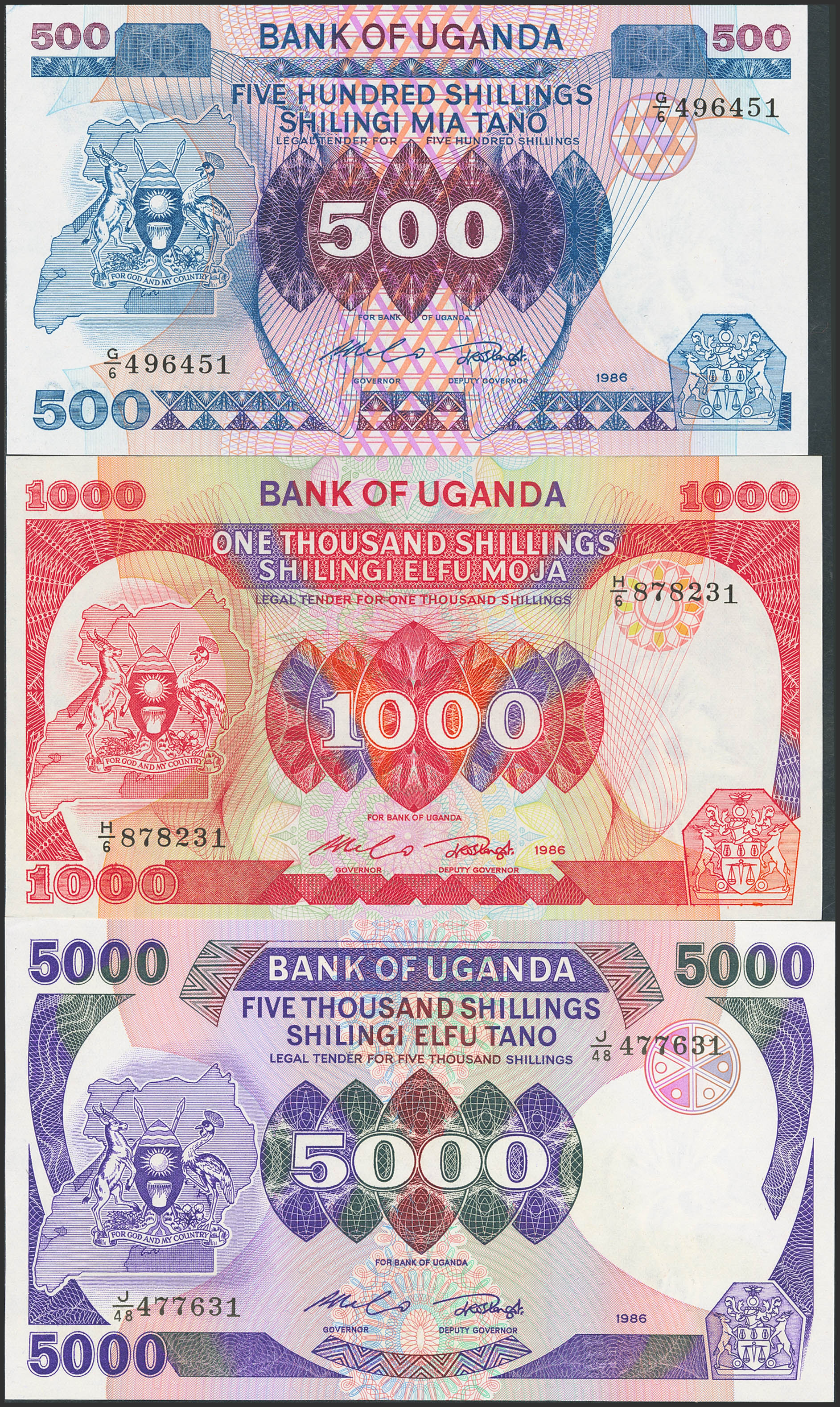 English UGANDA. Complete set of 3 notes from 500 to 5000 Shillings. 1986. Bank of Uganda. (Pick: 24b, 25, 26). Uncirculated.