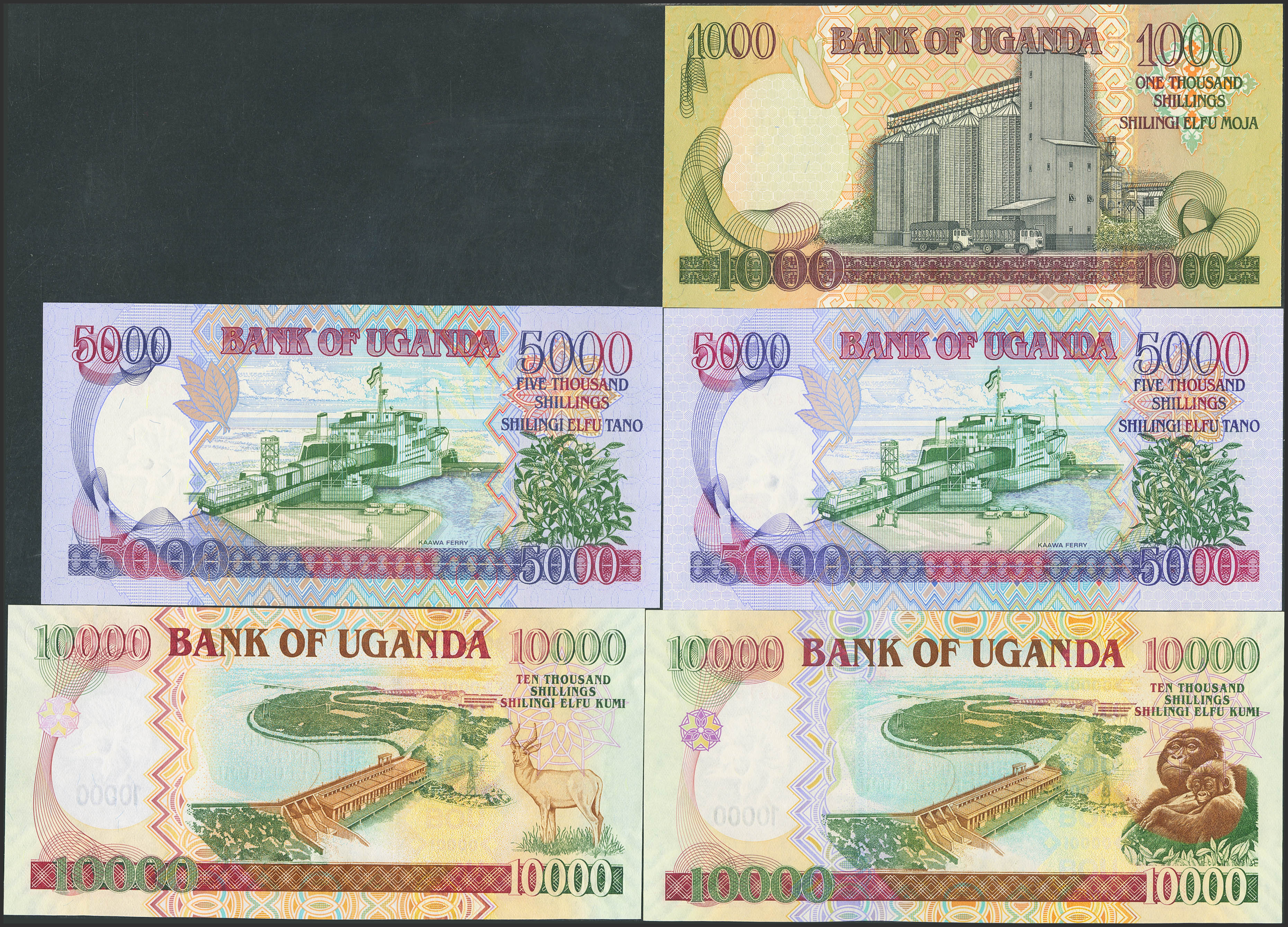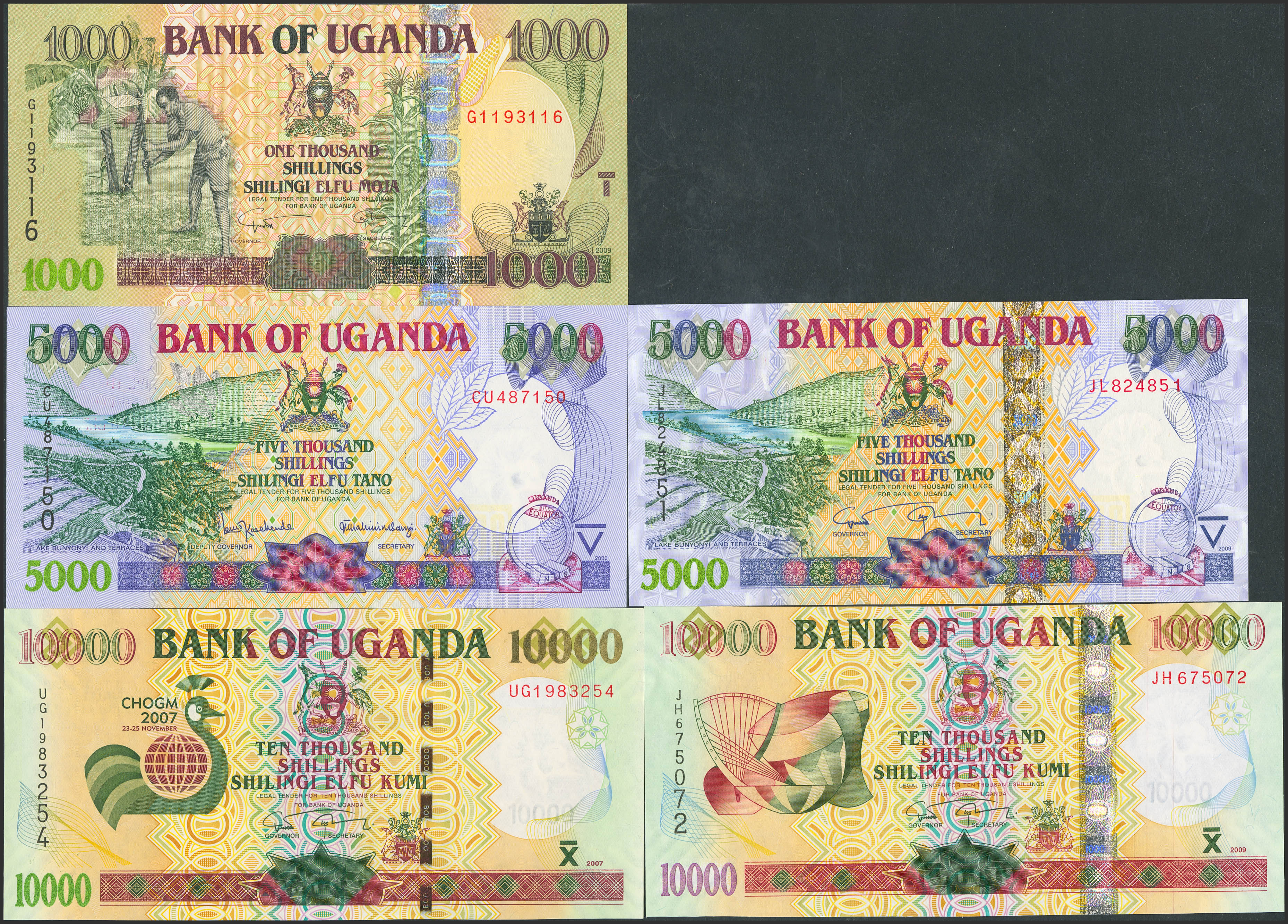 English UGANDA. Lot of 5 notes of 1000, 5000 and 10000 Shillings. 2000 to 2009. Bank of Uganda. (Pick: 40a, 43d, 44d, 45c, 48). Uncirculated.