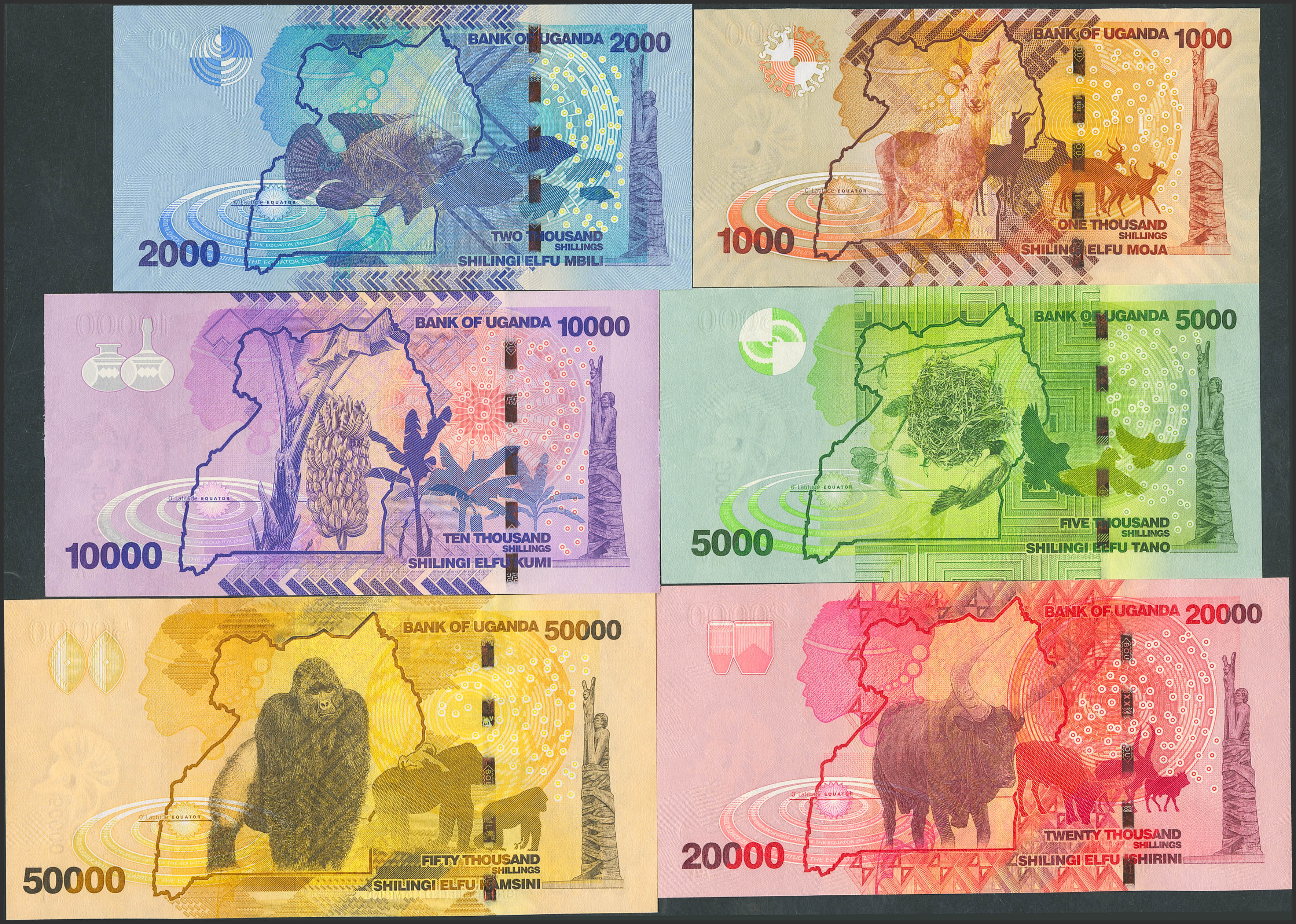English UGANDA. Complete set of 6 notes from 1000 to 50000 Shillings. 2010. Bank of Uganda. (Pick: 49a, 50a, 51a, 52a, 53a, 54a). Uncirculated.
