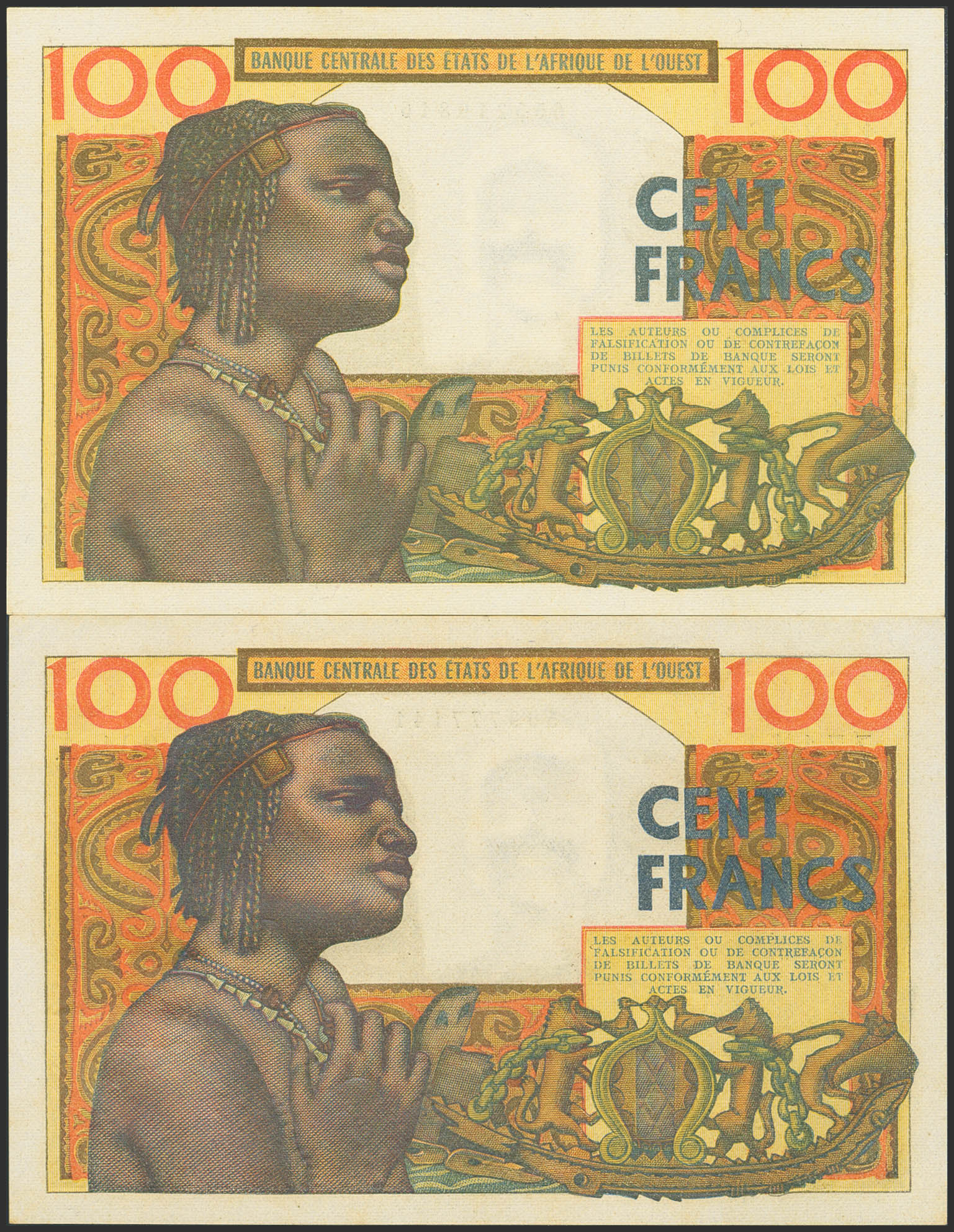 WEST AFRICAN STATES. Lot of 2 notes of 100 Francs. 2 December 1964 and not dated. Banque Centrale des Etats de l'Afrique de l'Ouest. Ivory Coast. (Pick: 101Ad, 101Ag). Less than Uncirculated.