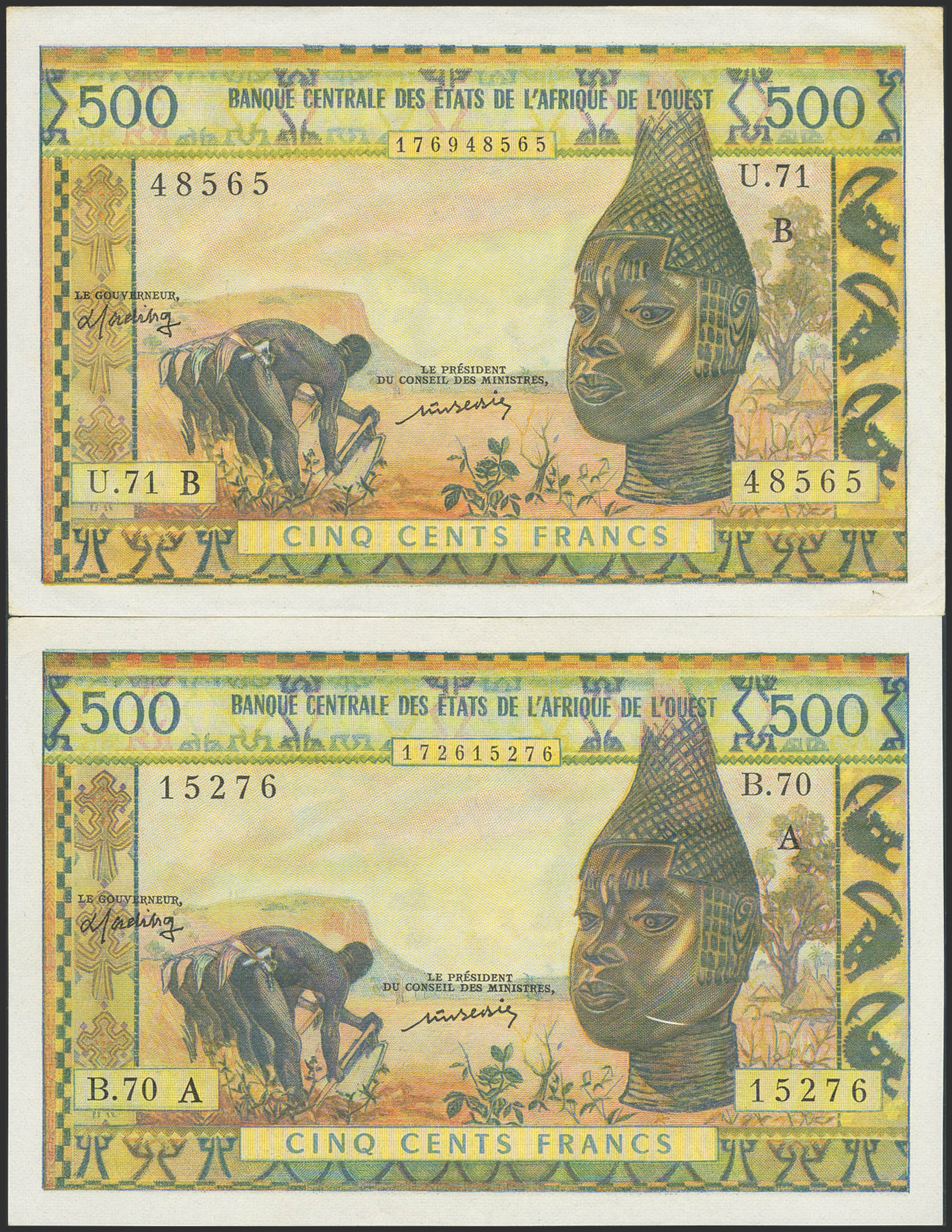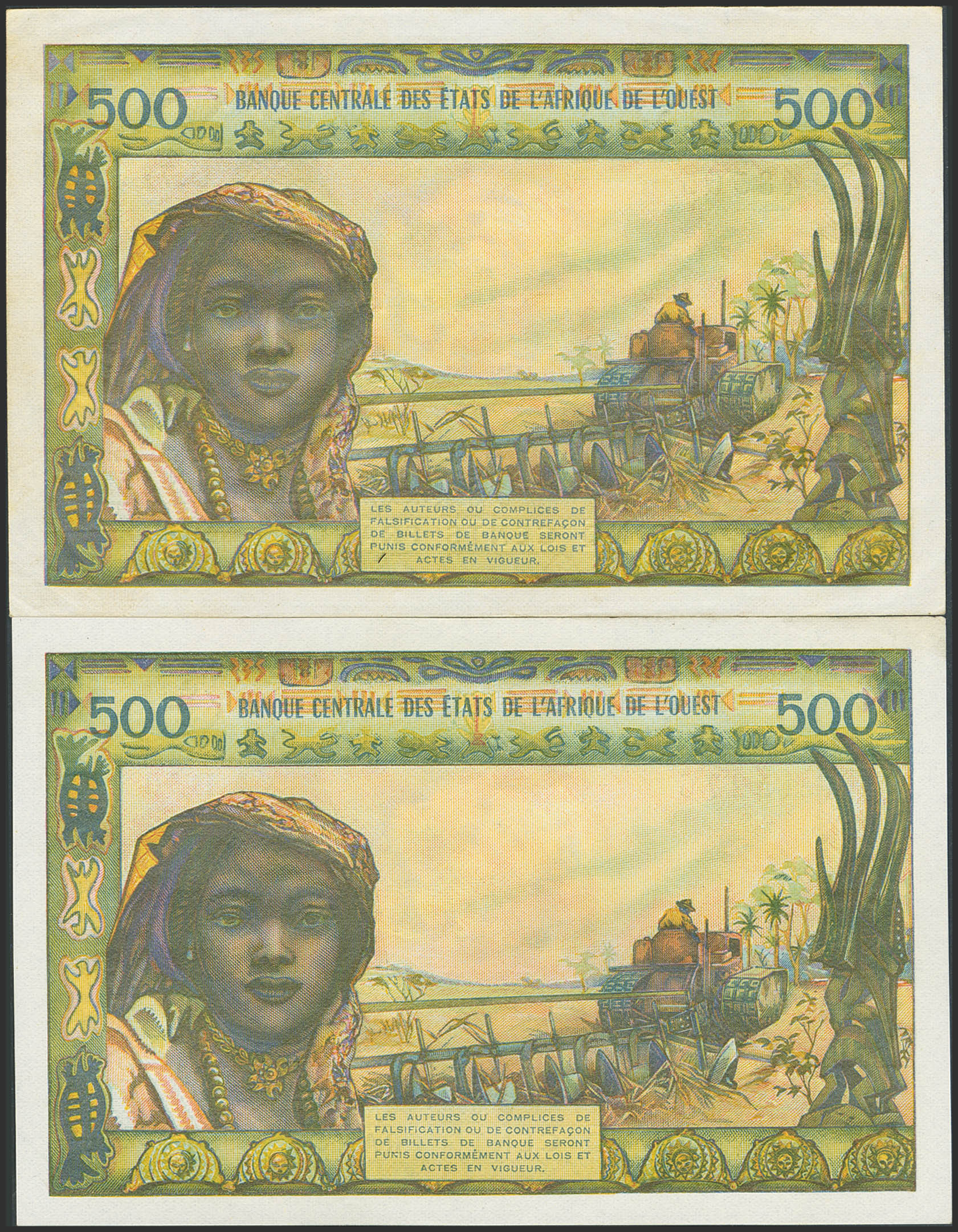 WEST AFRICAN STATES. Lot of 2 notes of 500 Francs. Not dated. Banque Centrale des Etats de l'Afrique de l'Ouest. Ivory Coast and Benin. (Pick: 102Al, 202Bl). Less than Uncirculated.