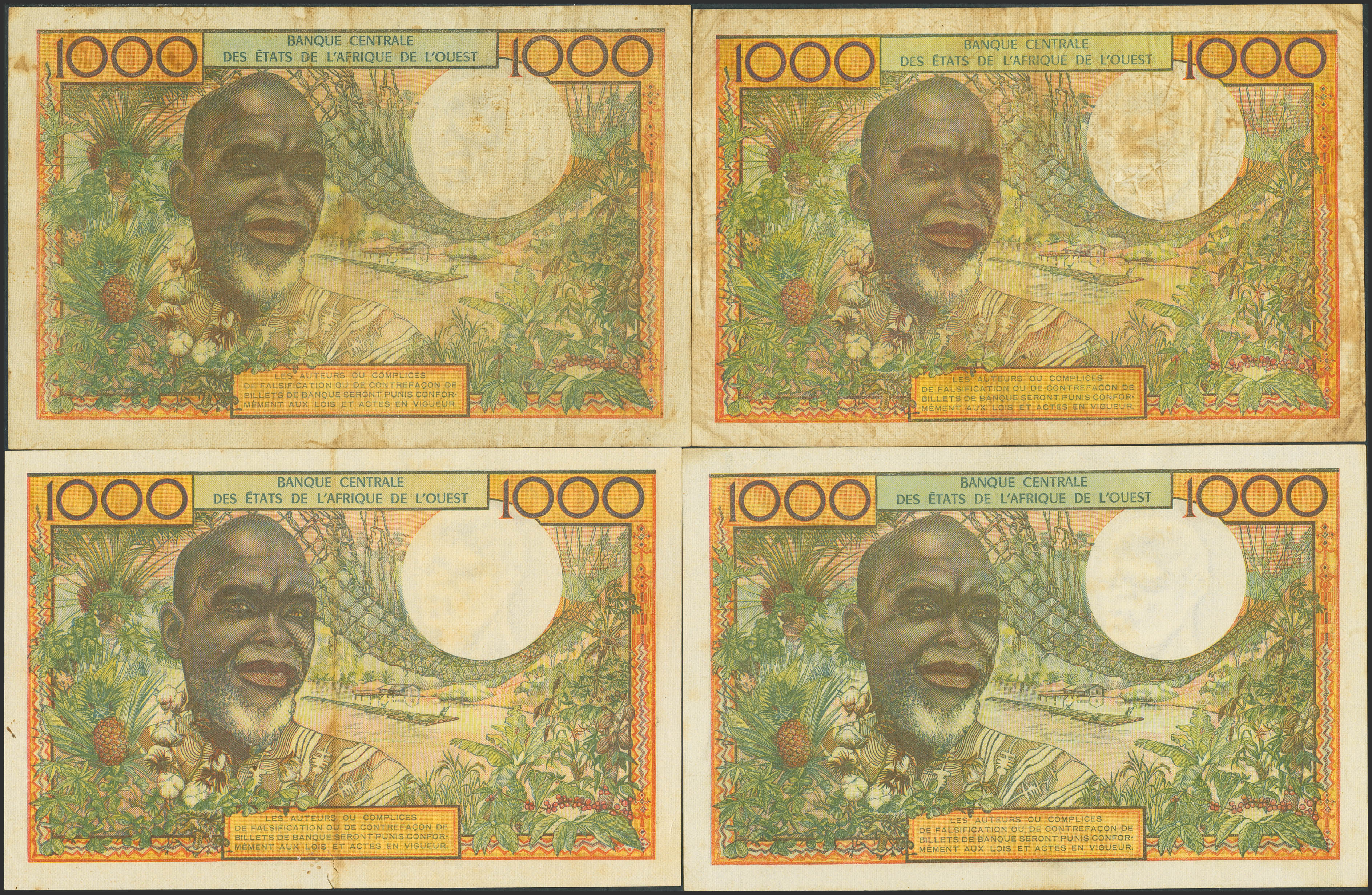 WEST AFRICAN STATES. Lot of 4 notes of 1000 Francs. (1960ca). Banque Centrale des Etats de l'Afrique de l'Ouest. Ivory Coast. Mixed signatures. (Pick: 103Ae, 103Af, 103Aj, 103Ak). Fine to Almost Uncirculated.