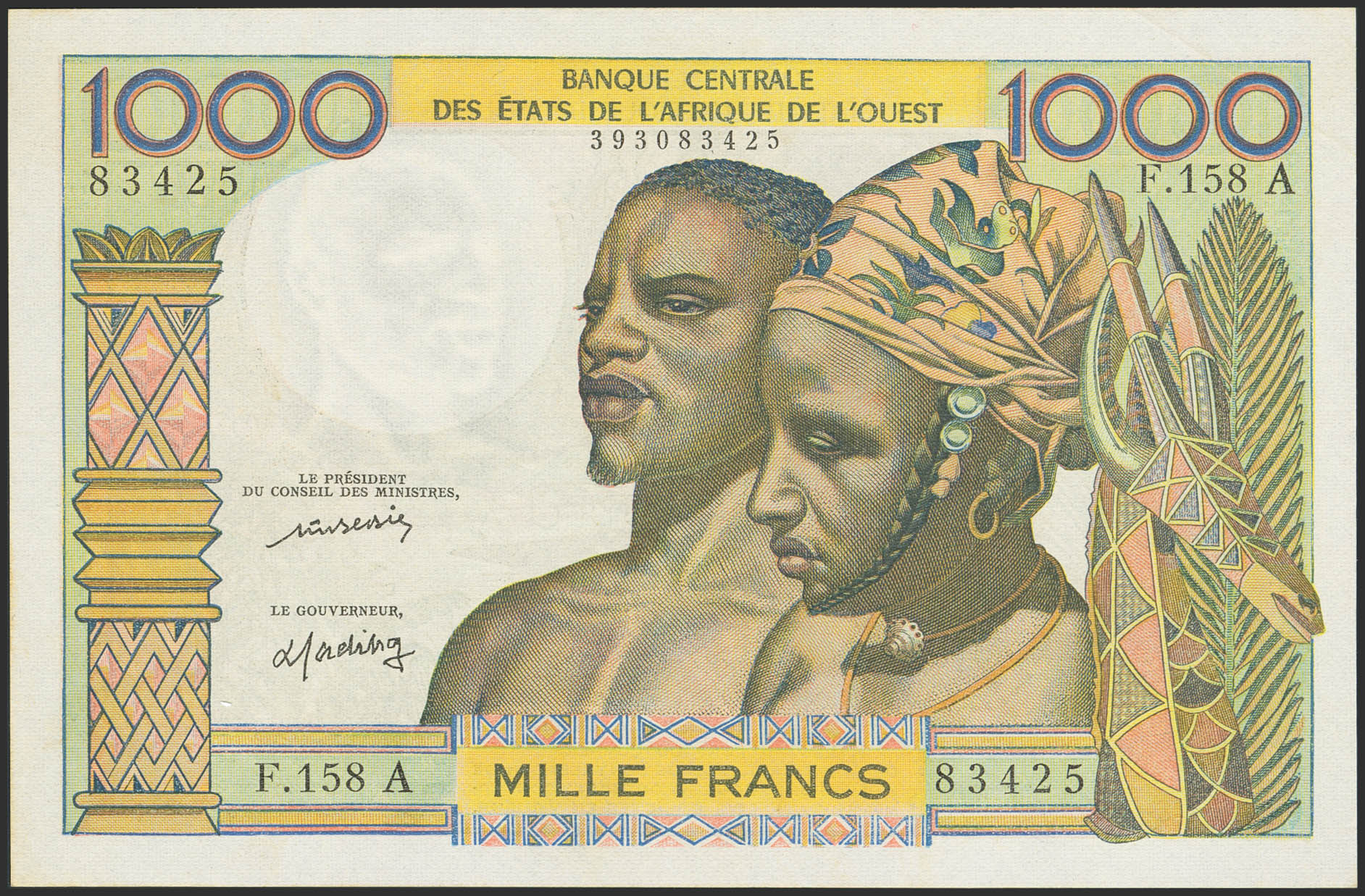 WEST AFRICAN STATES. 1000 Francs. (1960ca). Banque Centrale des Etats de l'Afrique de l'Ouest. Ivory Coast. Signatures of HC Bedie and A. Fadiga. (Pick: 103Al). More than Extremely Fine.