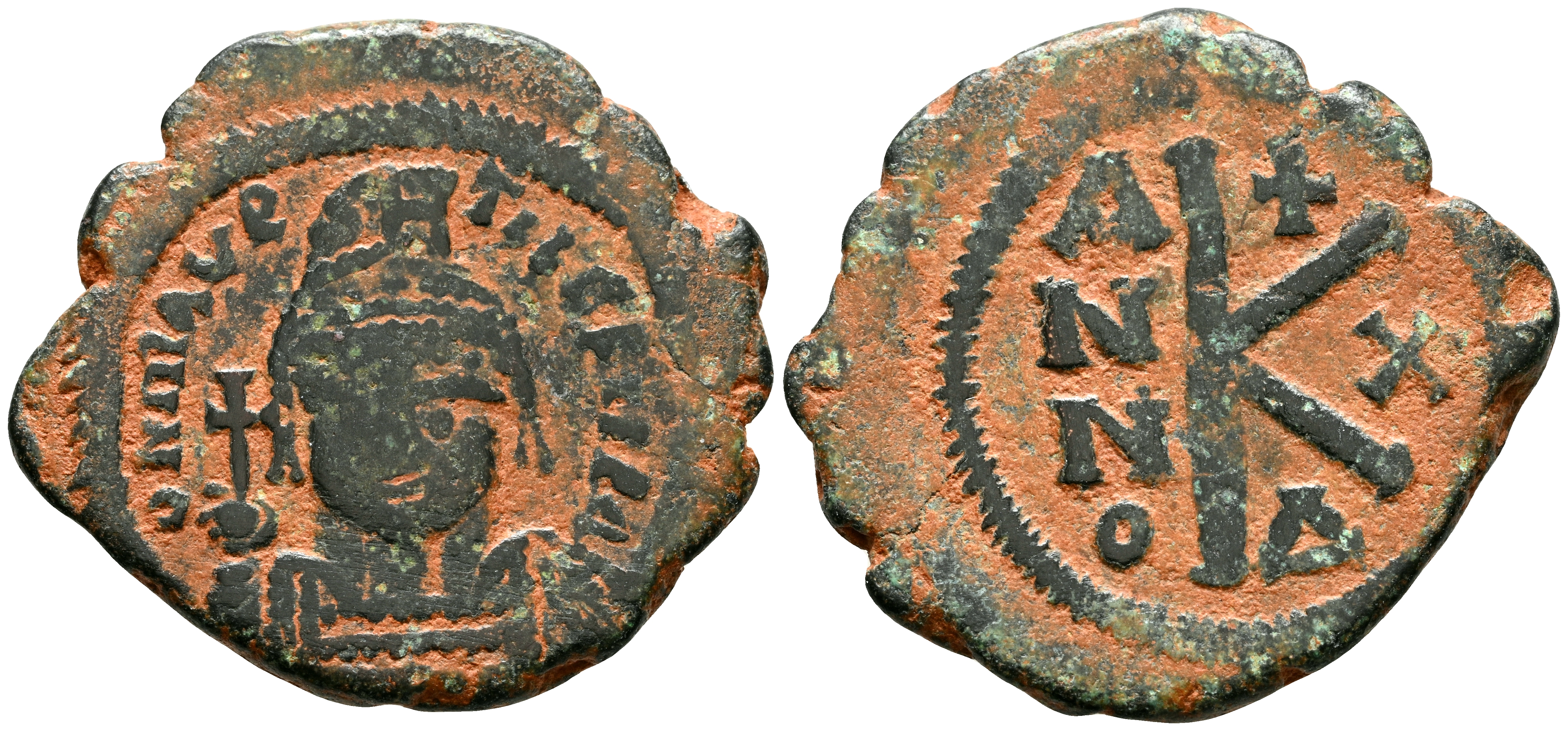 MAURIT TIBERIUS. 1/2 Follis. (Ar. 5.34g/25mm). 594-595 AD Theoupolis, Antioch. (Seaby 535). Obv: Crowned and cuirassed bust of Maurice Tiberius holding a cross, around the legend: DN MAVR TIBER PP AV. Rev: Large K, above a cross, to the sides: ANNO-X, below: A. Very Fine.