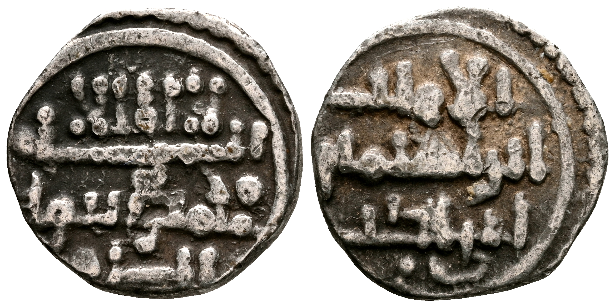 English ALMORAVIDS. Ibrahim Ben Abu Bakr Ben 'Umar (c. 1068-1077). Quirate. (Ar. 0.95g/12mm). Undated. (Vives does not cite; Hazard does not cite; Benito AB1). Obverse: 'Shahadah' in four lines. Reverse: الامير (the Emir) / ابرا هيم بن (Ibrahim son of) / ابي بكـر (Abu Bakr). Very Fine. Extremely rare. Even though he was the son of Abu Bakr, little is known about this figure from the sources. Numismatic literature records a series of Dinars minted by him in Segilmesa between the years 462-467H, while this is the only type of qirate known from this ruler and was published by Benito de los Mozos (Gaspariño 2017, 83-86) and has the same characteristics as those issued in the name of his father.