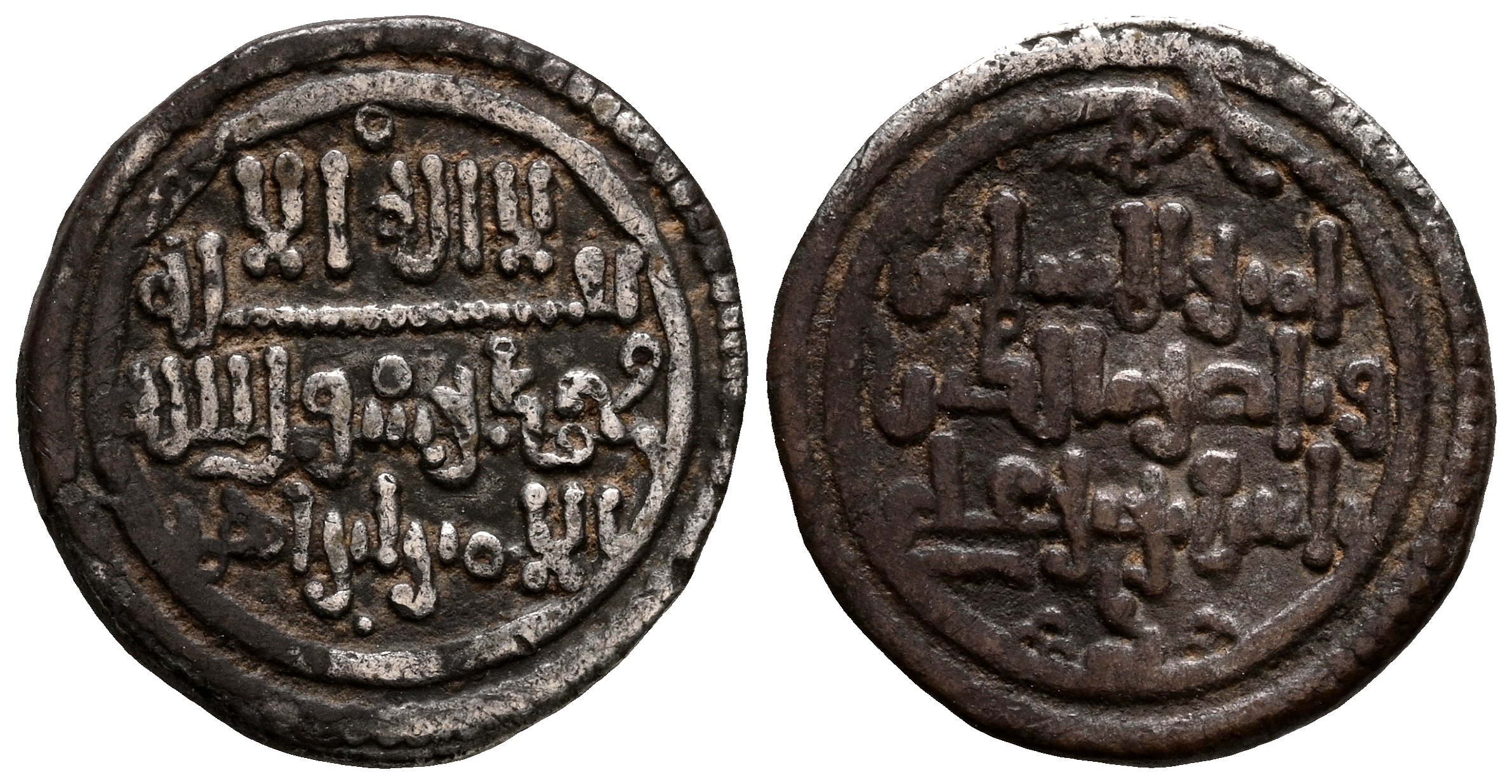 ALMORAVIDS. Tashfin ben Ali and Emir Ibrahim (539-540 AH). Kyrate. (Ar. 0.88g/12mm). S/D. (Vives 1885; Hazard 1035; Benito Db2). Obv: 'Shahada' in three lines, below mention of the heir: الامير ابرهيم. Rev: Presents Tashfin with the titles of Amir al-Muslimin and Nasir al-Din. Very Fine.