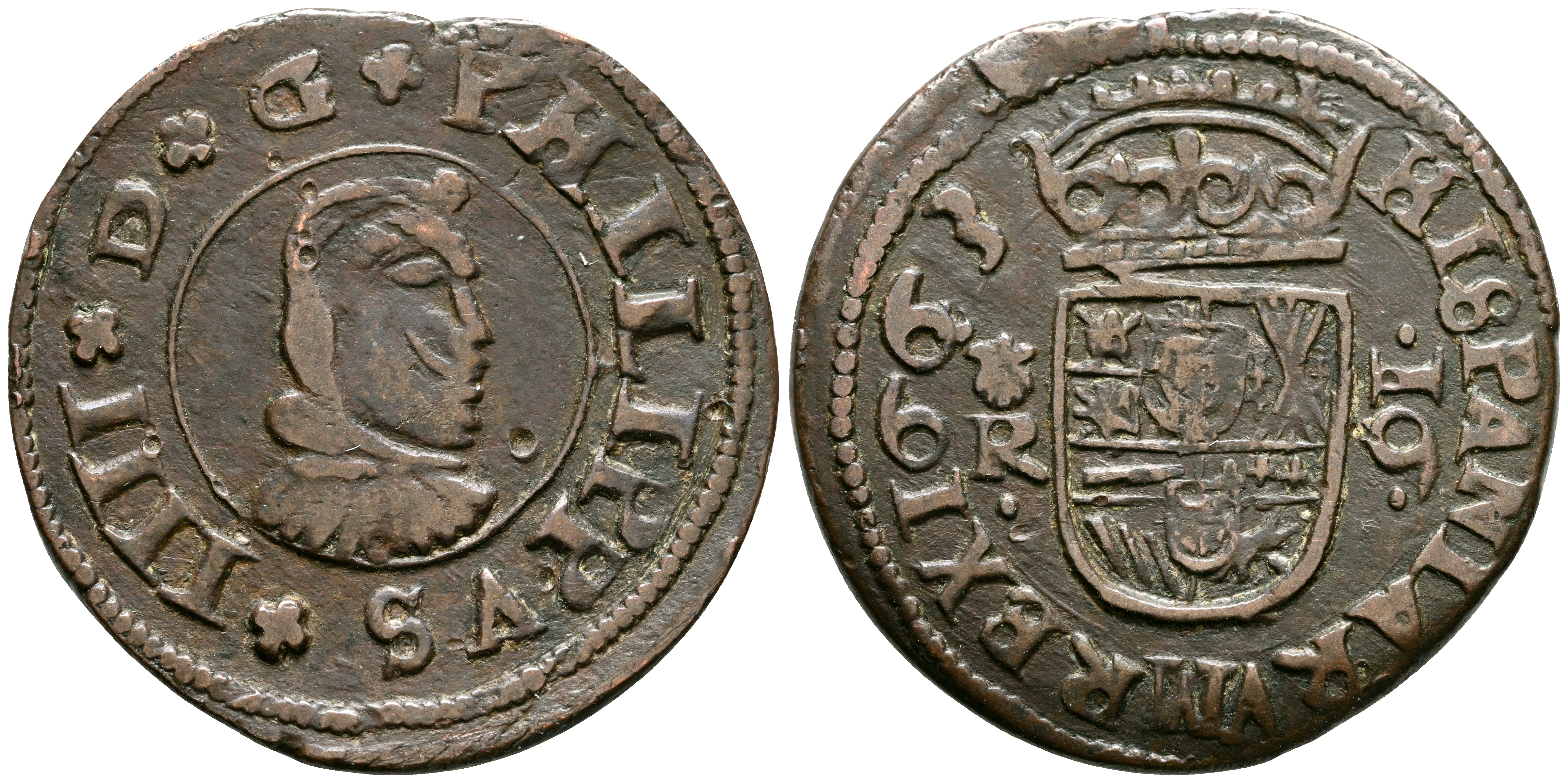 English PHILIP IV (1621-1665). 16 Maravedis. (Ve. 4.57g/25mm). 1663. La Coruña R. (Cal-2019-453). Very Fine-.