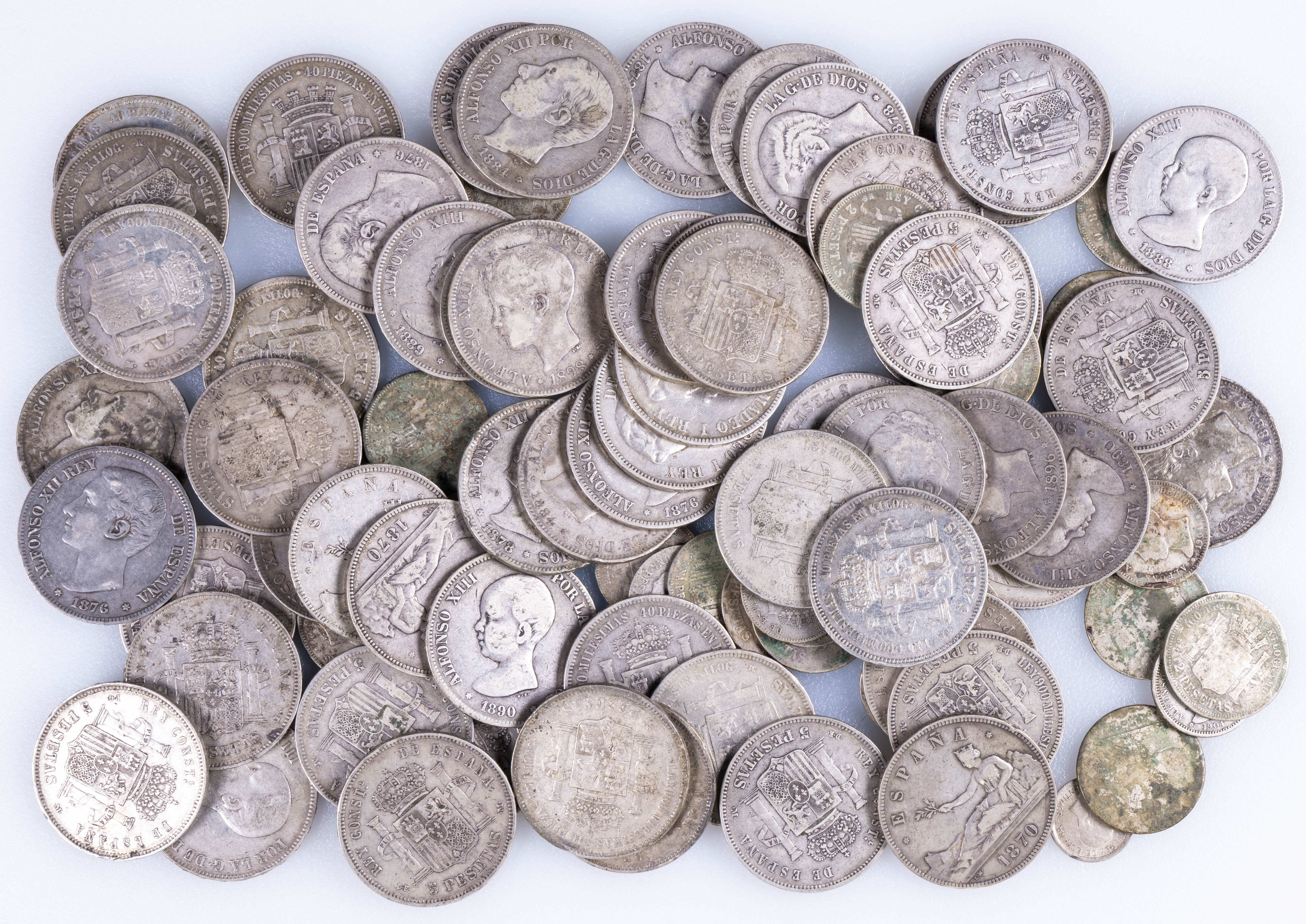 English A collection of over 80 silver coins, including 59 five-peseta coins. The coins represent a variety of dates, including the Provisional Government, the reigns of Amadeo I, and Alfonso XII and XIII. Approximate weight of the collection: 1.6 kg. Various states of preservation. Examination is essential.