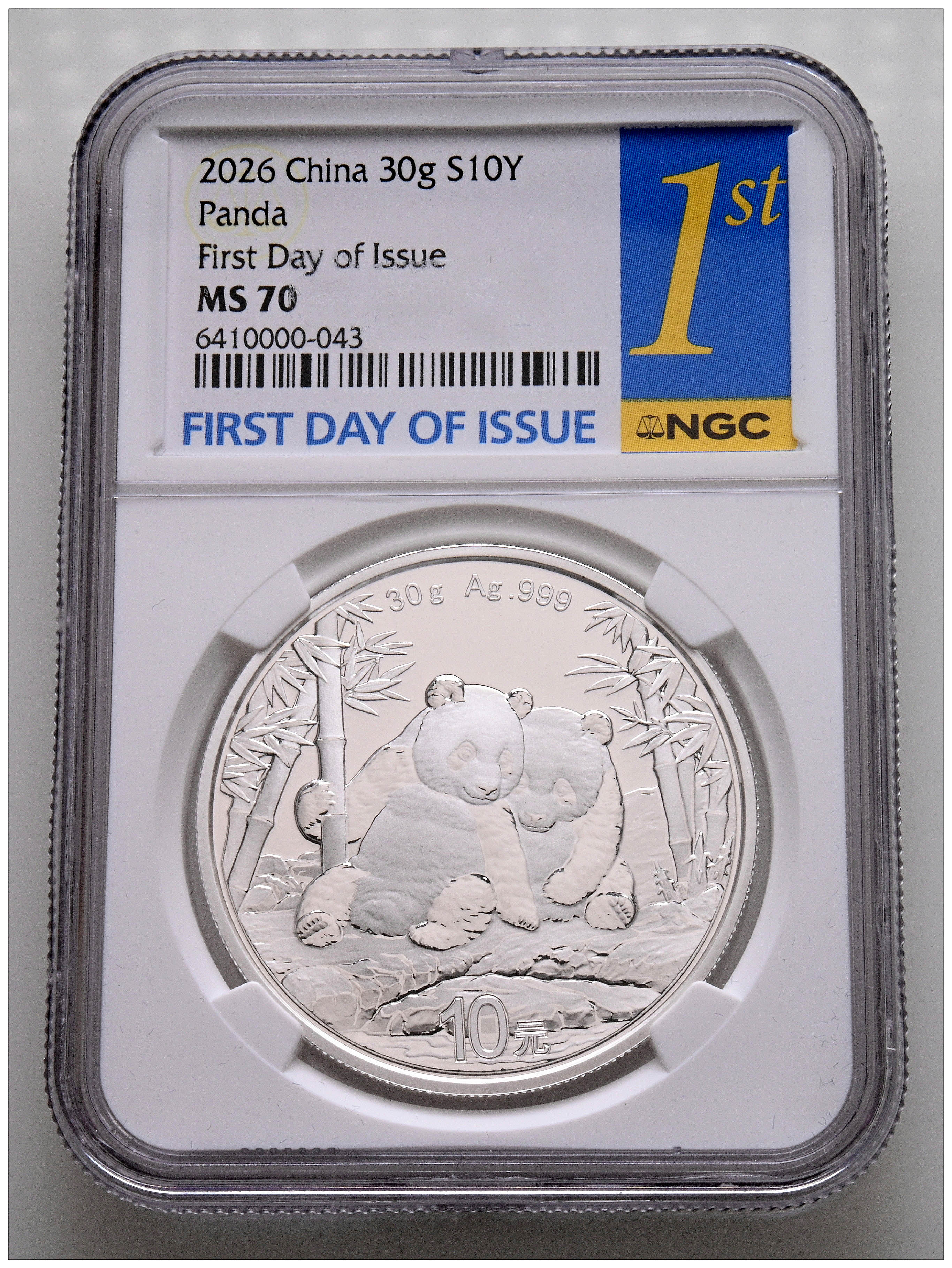 CHINA. 10 Yuan. (Ar. 30.00g/40mm)*. 2026. Panda Series. First Day of Issue. Encapsulated by NGC MS 70. *Theoretical weight and dimensions.