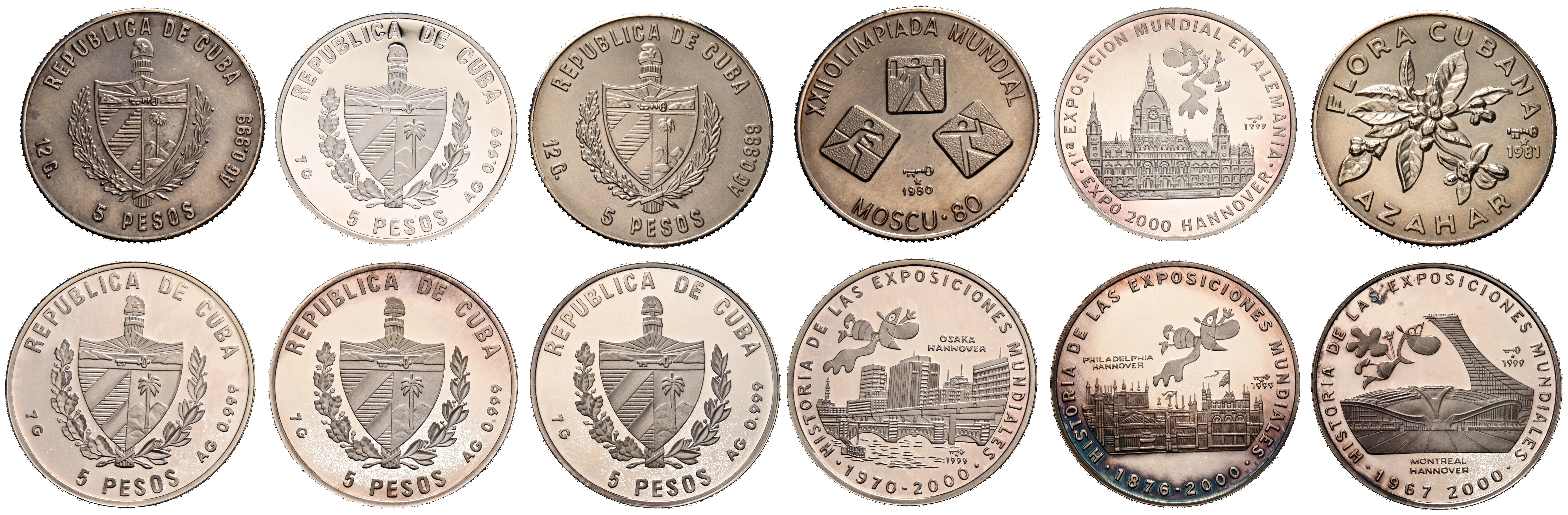 CUBA. Attractive set of six 5-Peso coins, all different, commemorative silver coins. Variety of themes and dates. PROOF and FDC finishes. TO BE EXAMINED